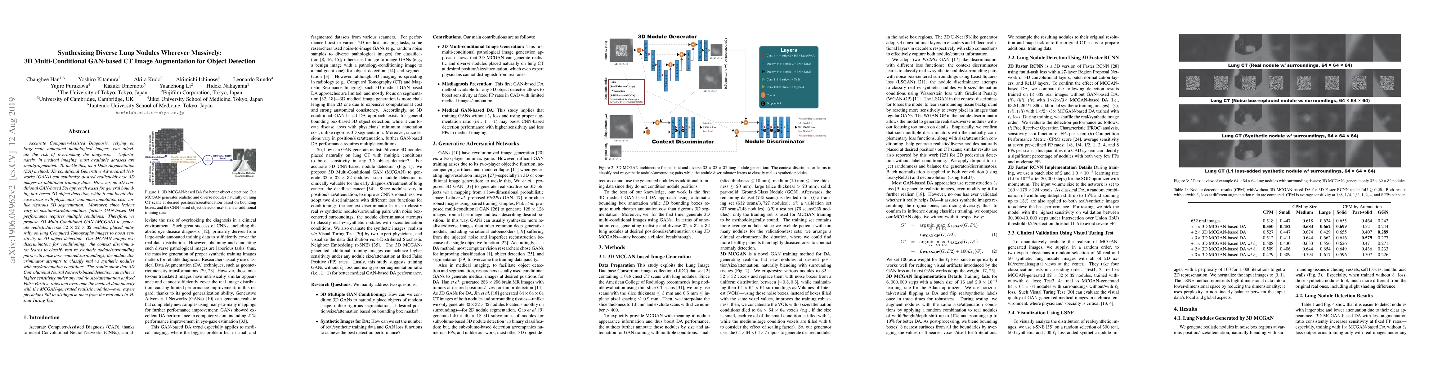 Accurate Computer-Assisted Diagnosis, relying on large-scale annotated pathological images, can alleviate the risk of overlooking the diagnosis. Unfortunately, in medical imaging, most available datasets are small/fragmented. To tackle this, as a Data Augmentation (DA) method, 3D conditional Generative Adversarial Networks (GANs) can synthesize desired realistic/diverse 3D images as additional training data. However, no 3D conditional GAN-based DA approach exists for general bounding box-based 3D object detection, while it can locate disease areas with physicians' minimum annotation cost, unlike rigorous 3D segmentation. Moreover, since lesions vary in position/size/attenuation, further GAN-based DA performance requires multiple conditions. Therefore, we propose 3D Multi-Conditional GAN (MCGAN) to generate realistic/diverse 32 X 32 X 32 nodules placed naturally on lung Computed Tomography images to boost sensitivity in 3D object detection. Our MCGAN adopts two discriminators for conditioning: the context discriminator learns to classify real vs synthetic nodule/surrounding pairs with noise box-centered surroundings; the nodule discriminator attempts to classify real vs synthetic nodules with size/attenuation conditions. The results show that 3D Convolutional Neural Network-based detection can achieve higher sensitivity under any nodule size/attenuation at fixed False Positive rates and overcome the medical data paucity with the MCGAN-generated realistic nodules---even expert physicians fail to distinguish them from the real ones in Visual Turing Test.