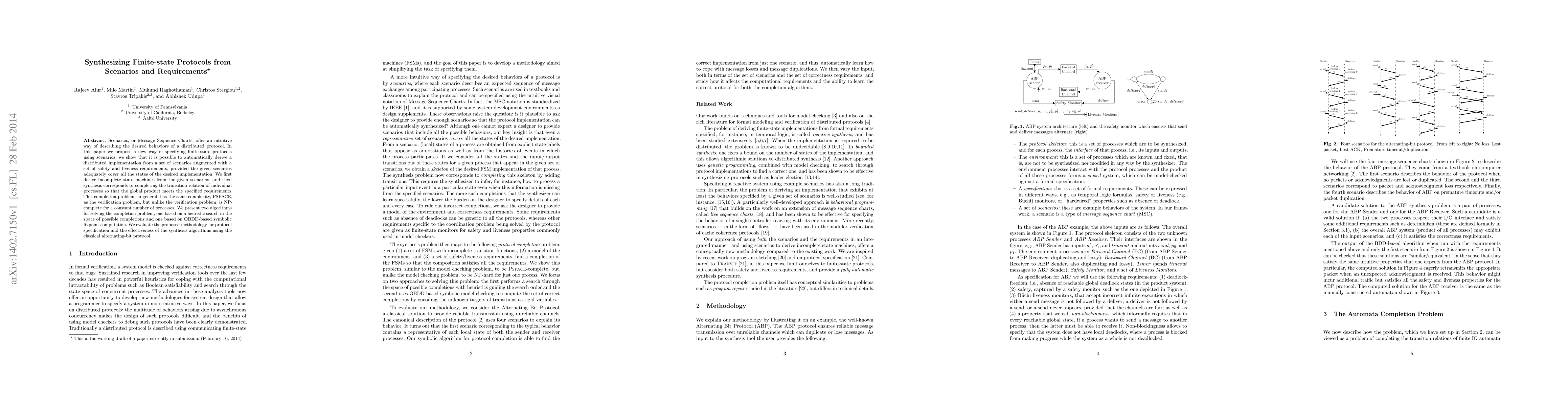 This paper proposes a method for automatically deriving finite-state protocols from scenarios and requirements, showing that given adequately covering scenarios, it is possible to synthesize a distributed implementation. The authors present two algorithms for solving the completion problem and evaluate their approach using the alternating-bit protocol.