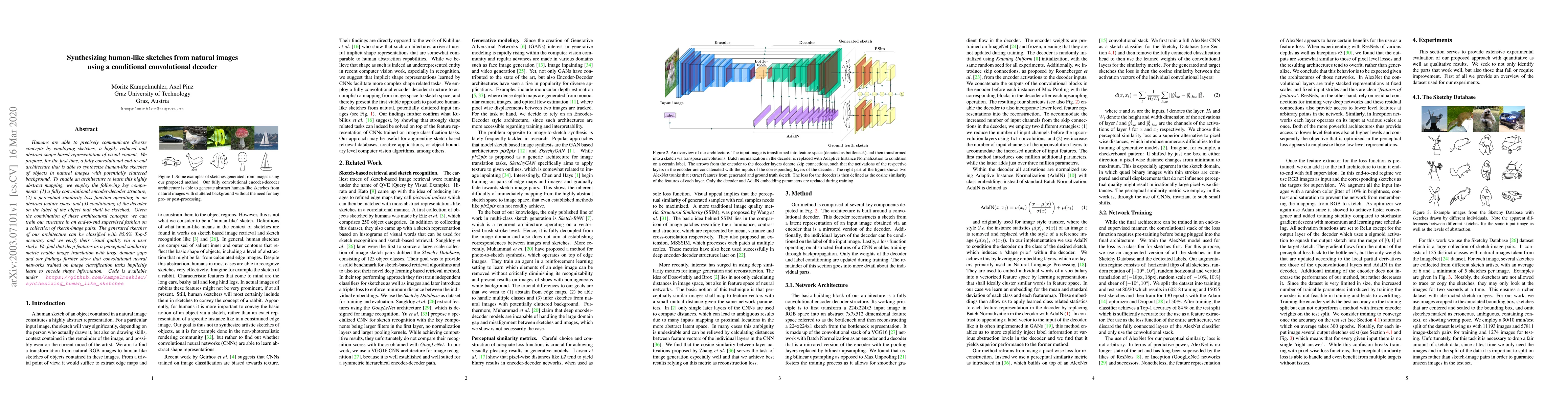 This paper proposes a fully convolutional architecture to synthesize human-like sketches from natural images, employing a perceptual similarity loss function and conditional decoding based on object labels. The model achieves 85.6% Top-5 classification accuracy and demonstrates high-quality sketch generation validated through a user study.