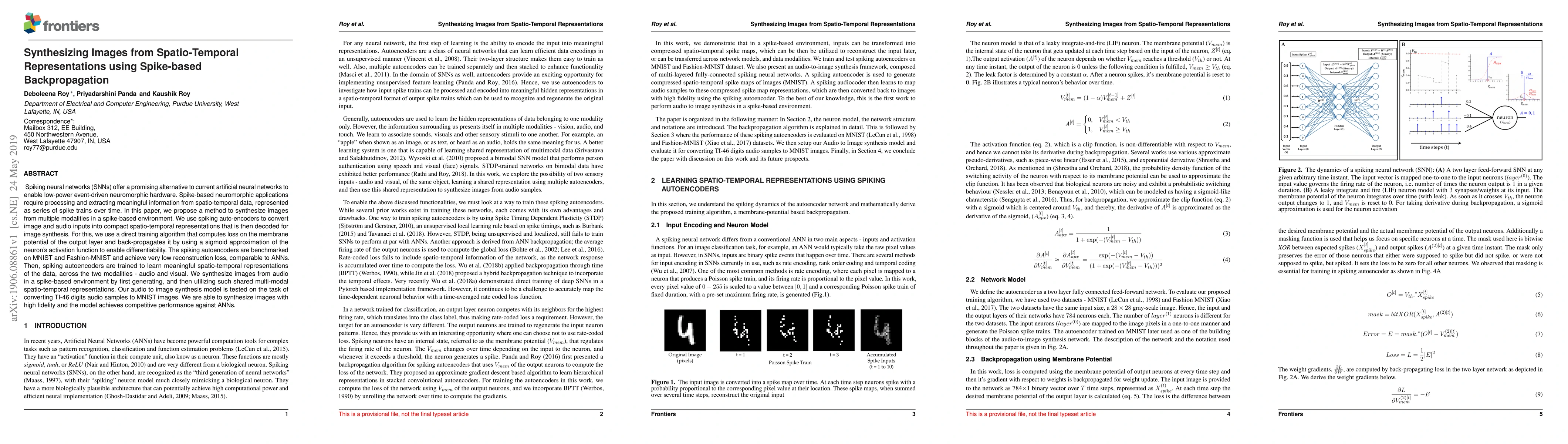 This paper proposes a method to synthesize images from spatio-temporal representations using spike-based backpropagation in spiking neural networks. It uses spiking autoencoders to convert image and audio inputs into compact representations, achieving low reconstruction loss and competitive performance against artificial neural networks.