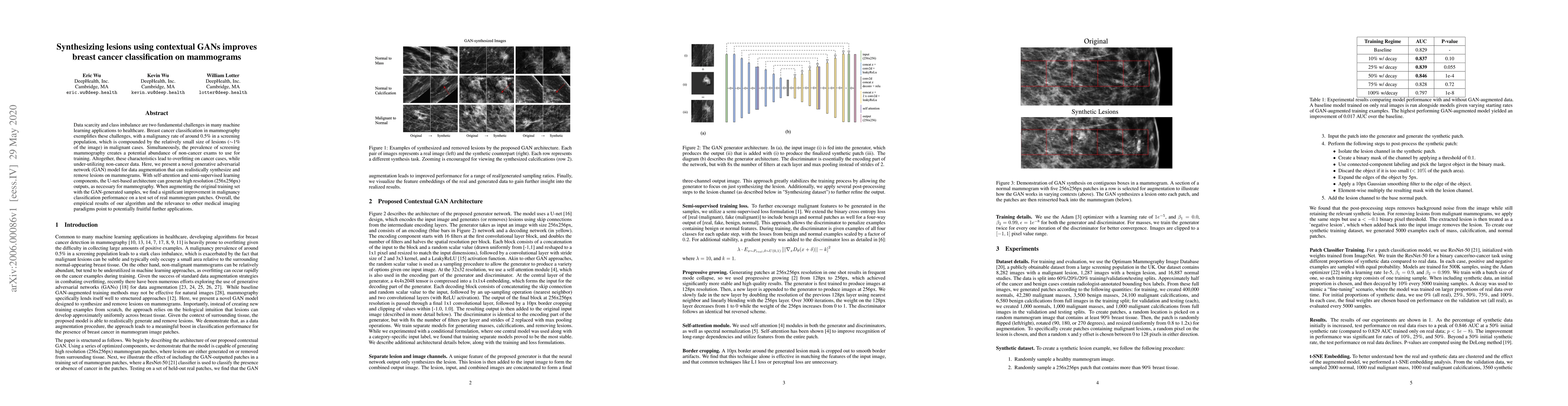 This paper introduces a contextual GAN model that synthesizes and removes lesions on mammograms to address data scarcity and class imbalance in breast cancer classification. The U-net-based architecture with self-attention and semi-supervised learning significantly improves classification performance on real mammogram patches when used for data augmentation.
