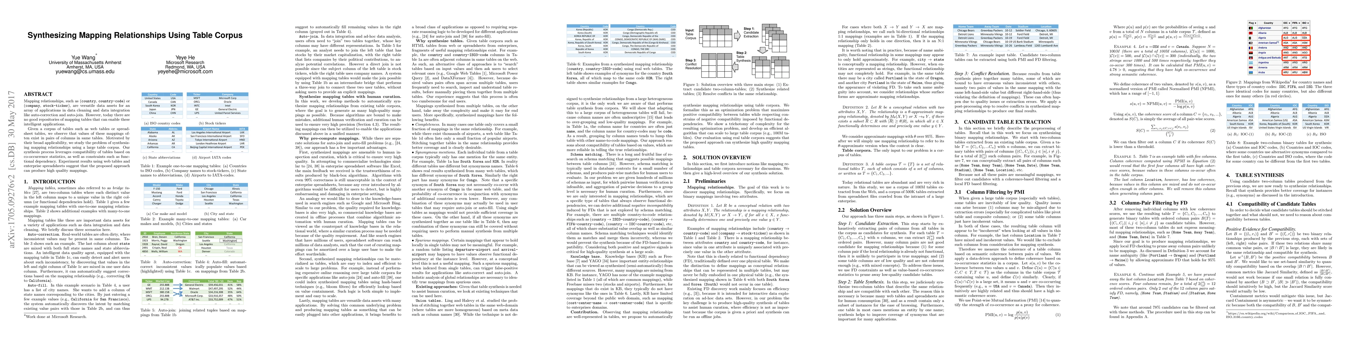 This paper proposes a method to synthesize mapping relationships, such as (country, country-code), from a corpus of tables, leveraging co-occurrence statistics and functional dependency. The results indicate that the approach can generate high-quality mappings for applications in data cleaning and integration.
