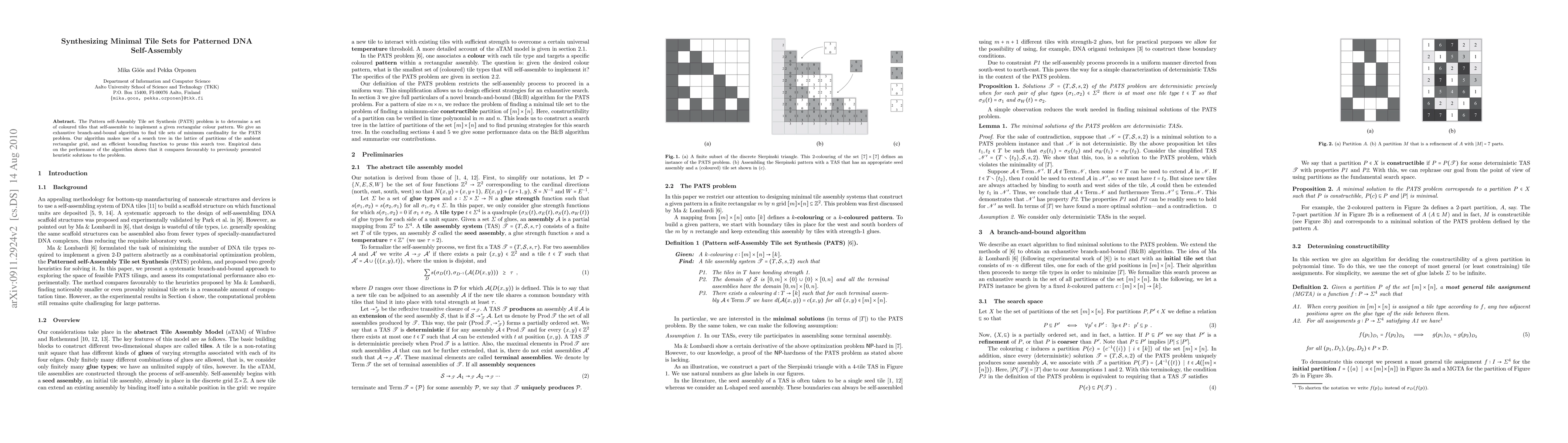 The Pattern self-Assembly Tile set Synthesis (PATS) problem is to determine a set of coloured tiles that self-assemble to implement a given rectangular colour pattern. We give an exhaustive branch-and-bound algorithm to find tile sets of minimum cardinality for the PATS problem. Our algorithm makes use of a search tree in the lattice of partitions of the ambient rectangular grid, and an efficient bounding function to prune this search tree. Empirical data on the performance of the algorithm shows that it compares favourably to previously presented heuristic solutions to the problem.