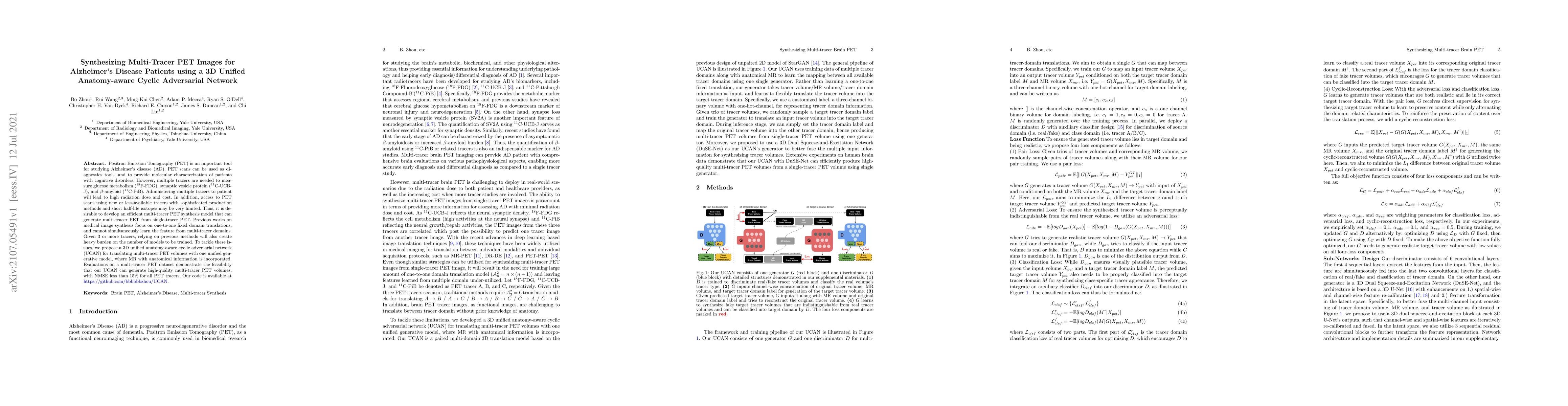 This paper proposes a 3D unified anatomy-aware cyclic adversarial network (UCAN) to synthesize multi-tracer PET images for Alzheimer's disease patients, reducing the need for multiple tracers and associated costs and radiation. The model successfully generates high-quality multi-tracer PET volumes with a normalized mean square error (NMSE) under 15%.