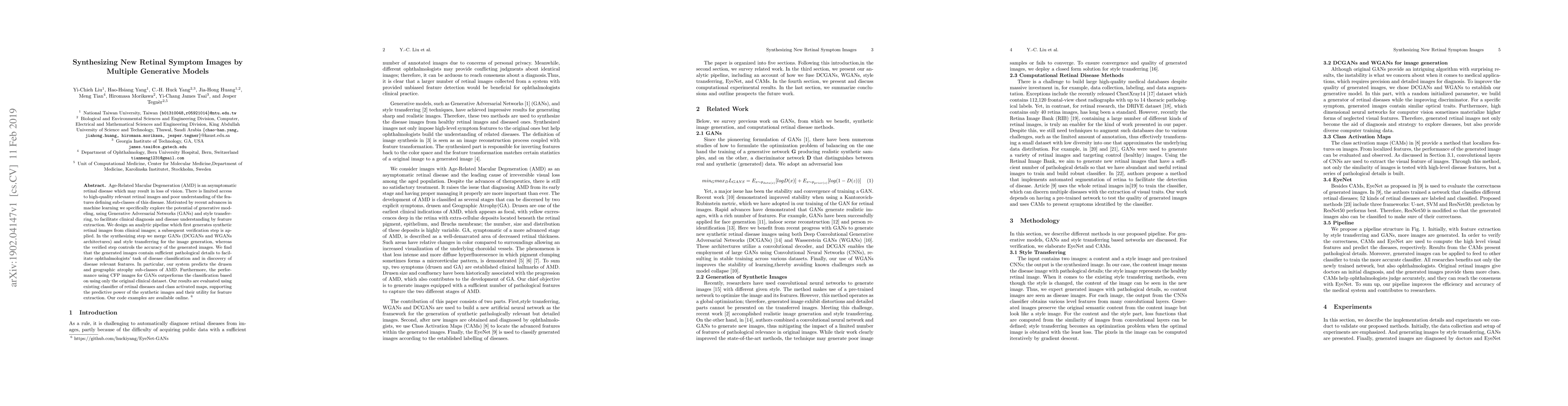 This paper explores the use of generative models, specifically GANs and style transferring, to synthesize new retinal images for Age-Related Macular Degeneration (AMD) diagnosis. The synthetic images show sufficient pathological details to aid in disease classification and feature extraction, outperforming original clinical datasets in predicting AMD sub-classes.
