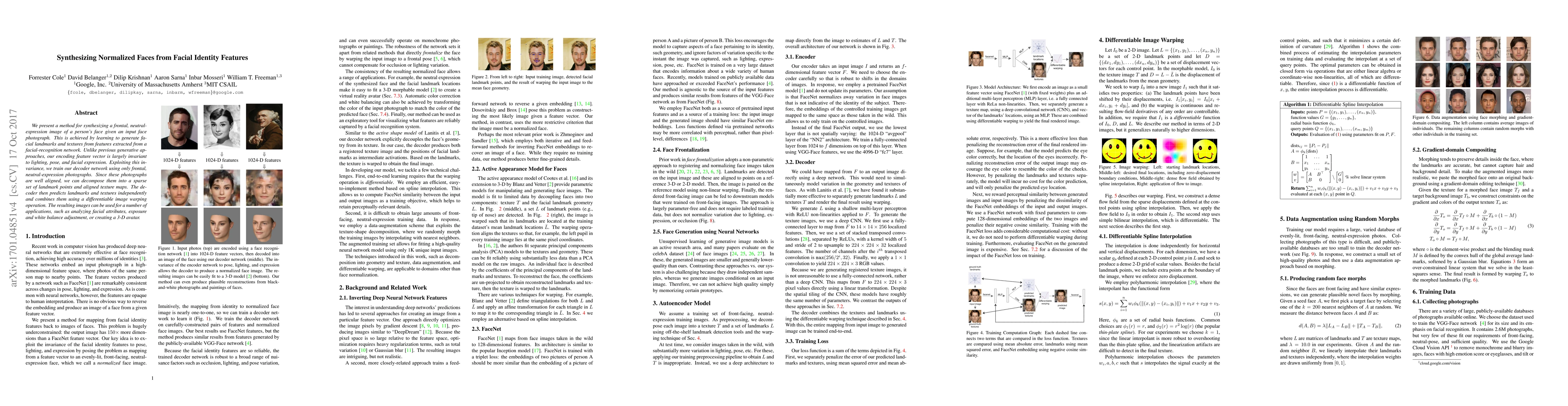 We present a method for synthesizing a frontal, neutral-expression image of a person's face given an input face photograph. This is achieved by learning to generate facial landmarks and textures from features extracted from a facial-recognition network. Unlike previous approaches, our encoding feature vector is largely invariant to lighting, pose, and facial expression. Exploiting this invariance, we train our decoder network using only frontal, neutral-expression photographs. Since these photographs are well aligned, we can decompose them into a sparse set of landmark points and aligned texture maps. The decoder then predicts landmarks and textures independently and combines them using a differentiable image warping operation. The resulting images can be used for a number of applications, such as analyzing facial attributes, exposure and white balance adjustment, or creating a 3-D avatar.