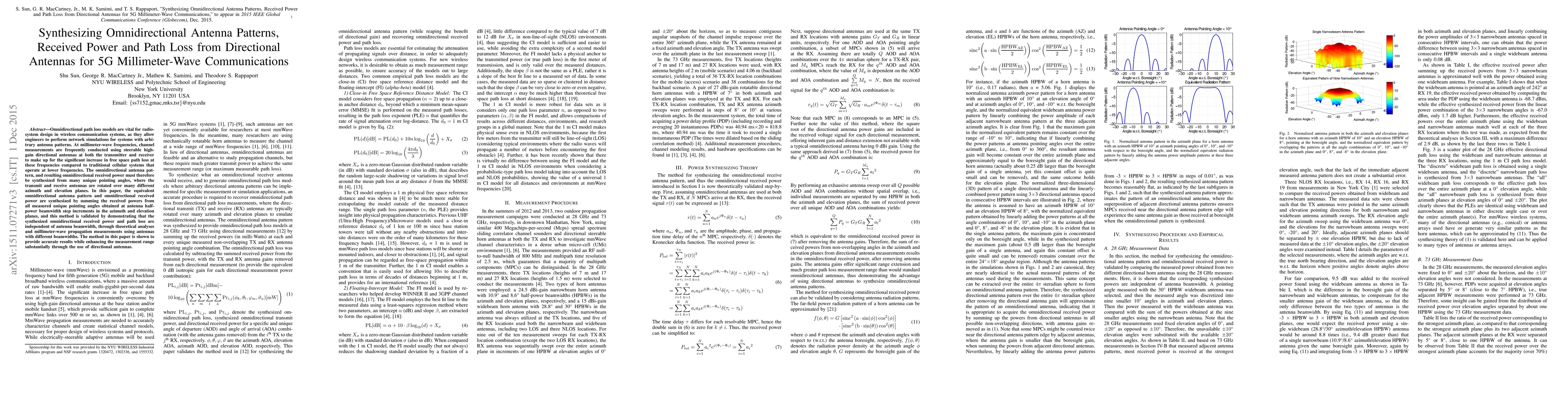 This paper presents a method for synthesizing omnidirectional antenna patterns and received power from directional antennas at millimeter-wave frequencies, which enhances measurement range and accuracy. The synthesized omnidirectional received power is validated as independent of antenna beamwidth, demonstrating the method's effectiveness for 5G communications.
