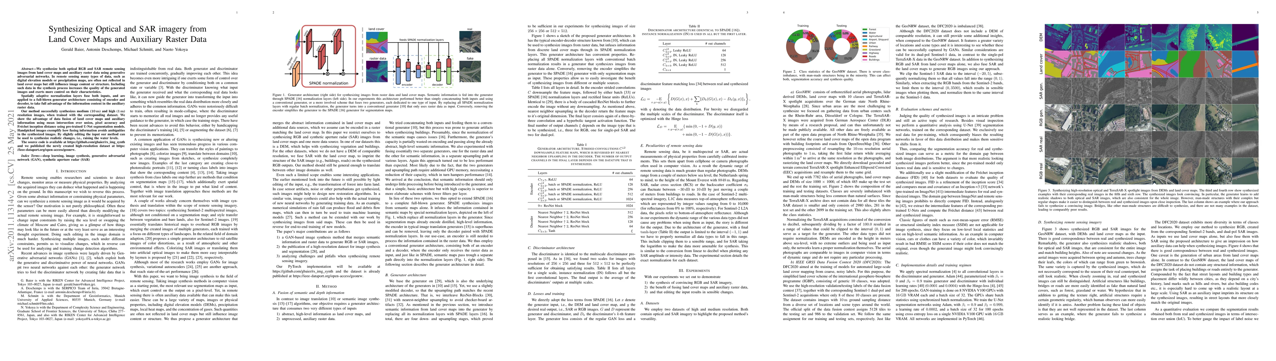 We synthesize both optical RGB and synthetic aperture radar (SAR) remote sensing images from land cover maps and auxiliary raster data using generative adversarial networks (GANs). In remote sensing, many types of data, such as digital elevation models (DEMs) or precipitation maps, are often not reflected in land cover maps but still influence image content or structure. Including such data in the synthesis process increases the quality of the generated images and exerts more control on their characteristics. Spatially adaptive normalization layers fuse both inputs and are applied to a full-blown generator architecture consisting of encoder and decoder to take full advantage of the information content in the auxiliary raster data. Our method successfully synthesizes medium (10 m) and high (1 m) resolution images when trained with the corresponding data set. We show the advantage of data fusion of land cover maps and auxiliary information using mean intersection over unions (mIoUs), pixel accuracy, and Fr\'echet inception distances (FIDs) using pretrained U-Net segmentation models. Handpicked images exemplify how fusing information avoids ambiguities in the synthesized images. By slightly editing the input, our method can be used to synthesize realistic changes, i.e., raising the water levels. The source code is available at https://github.com/gbaier/rs_img_synth and we published the newly created high-resolution dataset at https://ieee-dataport.org/open-access/geonrw.