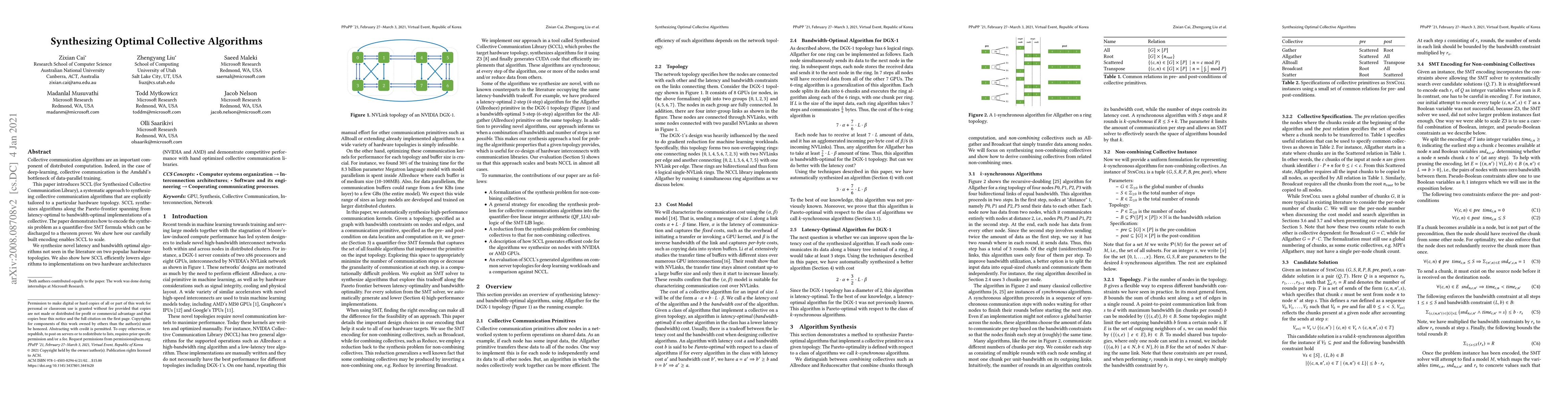 This paper presents SCCL, a library for synthesizing optimal collective communication algorithms tailored to specific hardware topologies, achieving both latency and bandwidth optimization. It demonstrates scalable synthesis through symmetry exploitation and introduces novel algorithms for popular hardware architectures, showing competitive performance against hand-optimized libraries.