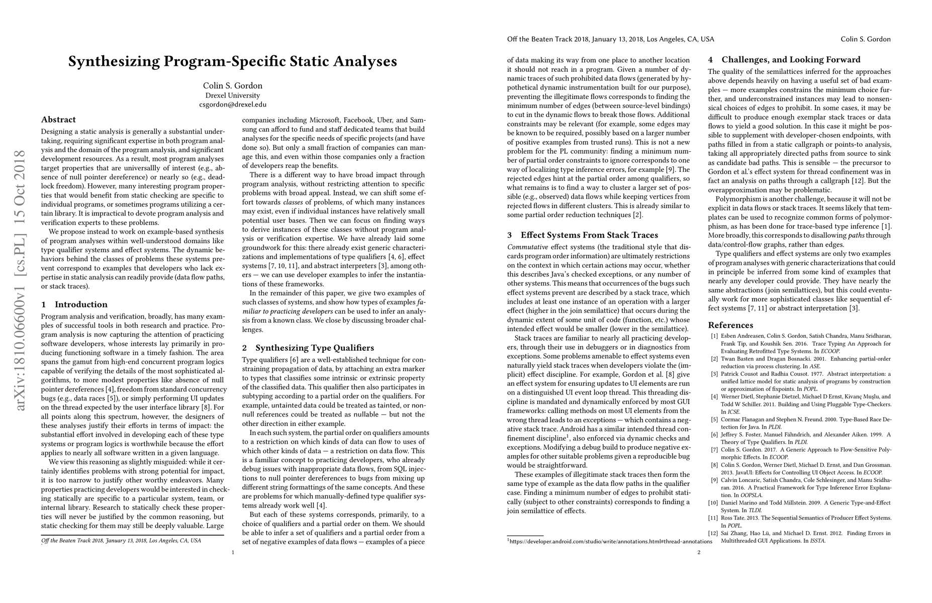 This paper proposes a method for synthesizing program-specific static analyses through example-based synthesis, focusing on domains like type qualifier systems and effect systems. It aims to enable developers to provide examples of dynamic behaviors, thereby generating tailored static analyses without requiring deep expertise in program analysis.