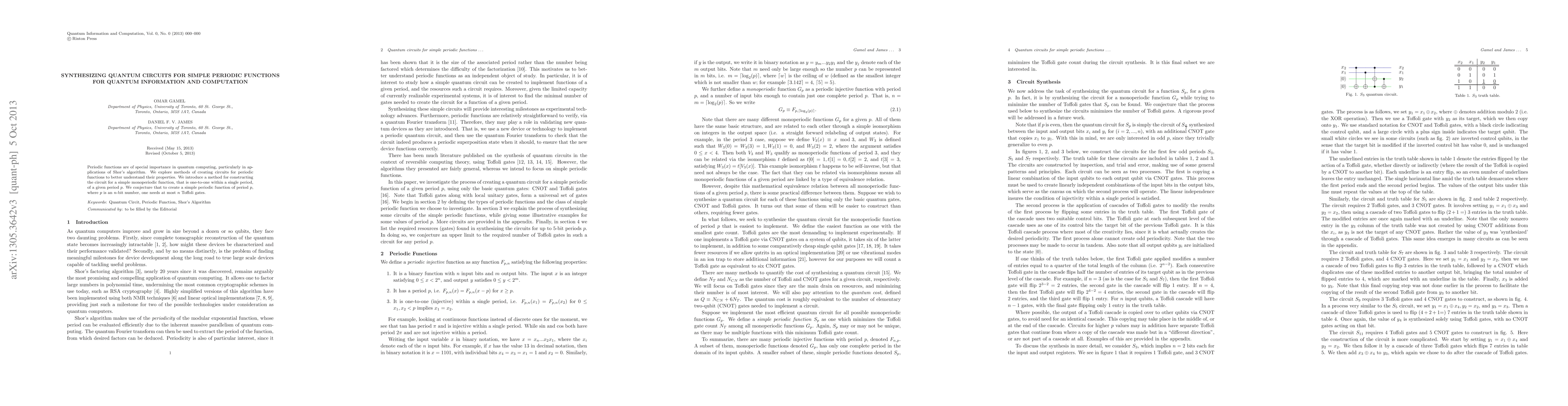 Periodic functions are of special importance in quantum computing, particularly in applications of Shor's algorithm. We explore methods of creating circuits for periodic functions to better understand their properties. We introduce a method for constructing the circuit for a simple monoperiodic function, that is one-to-one within a single period, of a given period p. We conjecture that to create a simples periodic function of period p, where p is an n-bit number, one needs at most n Toffoli gates.