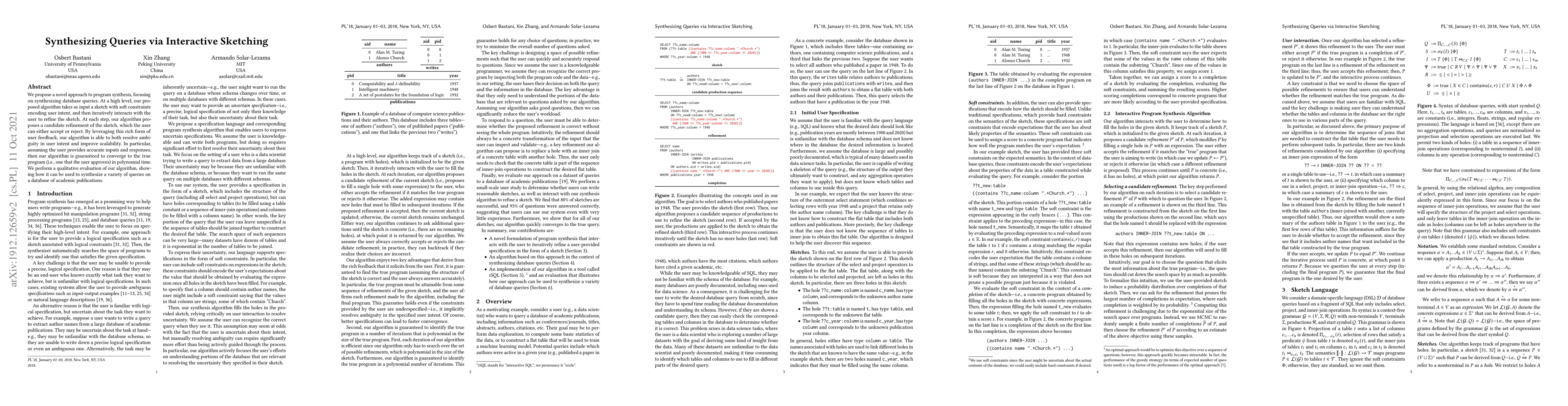 This paper introduces an interactive algorithm for synthesizing database queries by iteratively refining a user-provided sketch with soft constraints, leveraging user feedback to resolve ambiguity and improve scalability. The algorithm guarantees convergence to the correct query in polynomial time given accurate user inputs and responses.