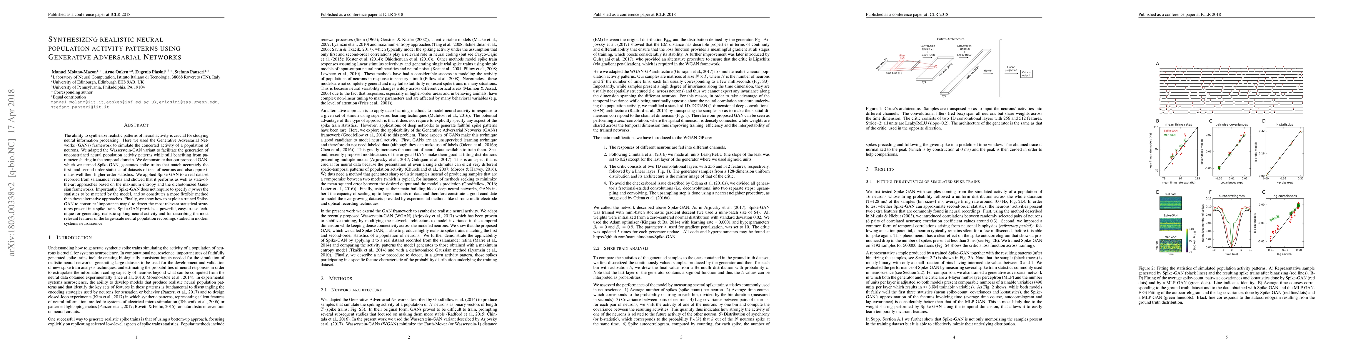 The ability to synthesize realistic patterns of neural activity is crucial for studying neural information processing. Here we used the Generative Adversarial Networks (GANs) framework to simulate the concerted activity of a population of neurons. We adapted the Wasserstein-GAN variant to facilitate the generation of unconstrained neural population activity patterns while still benefiting from parameter sharing in the temporal domain. We demonstrate that our proposed GAN, which we termed Spike-GAN, generates spike trains that match accurately the first- and second-order statistics of datasets of tens of neurons and also approximates well their higher-order statistics. We applied Spike-GAN to a real dataset recorded from salamander retina and showed that it performs as well as state-of-the-art approaches based on the maximum entropy and the dichotomized Gaussian frameworks. Importantly, Spike-GAN does not require to specify a priori the statistics to be matched by the model, and so constitutes a more flexible method than these alternative approaches. Finally, we show how to exploit a trained Spike-GAN to construct 'importance maps' to detect the most relevant statistical structures present in a spike train. Spike-GAN provides a powerful, easy-to-use technique for generating realistic spiking neural activity and for describing the most relevant features of the large-scale neural population recordings studied in modern systems neuroscience.