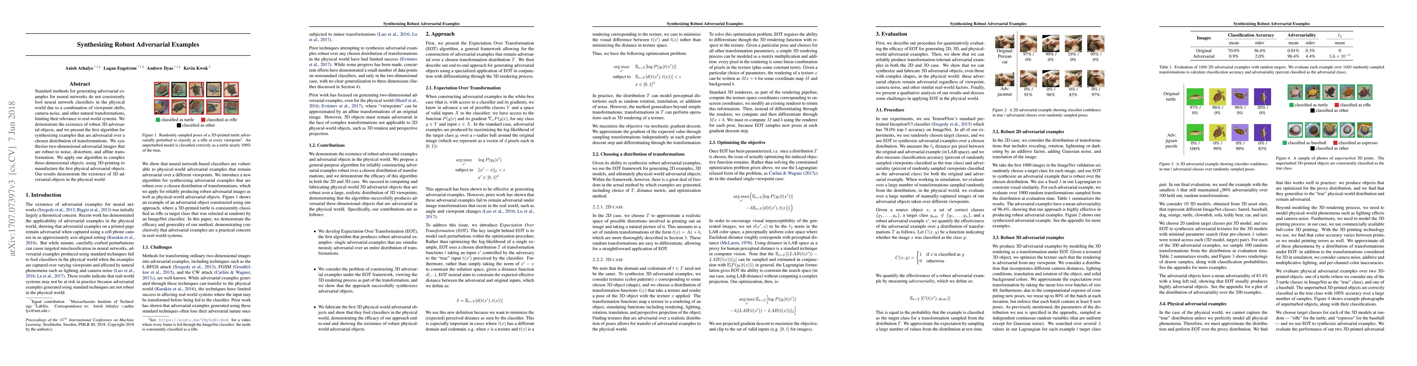 This paper introduces an algorithm for creating robust adversarial examples that can fool neural network classifiers under various real-world transformations, including noise and viewpoint shifts. The authors demonstrate the effectiveness of their method by producing 3D adversarial objects that are successfully manufactured via 3D printing.