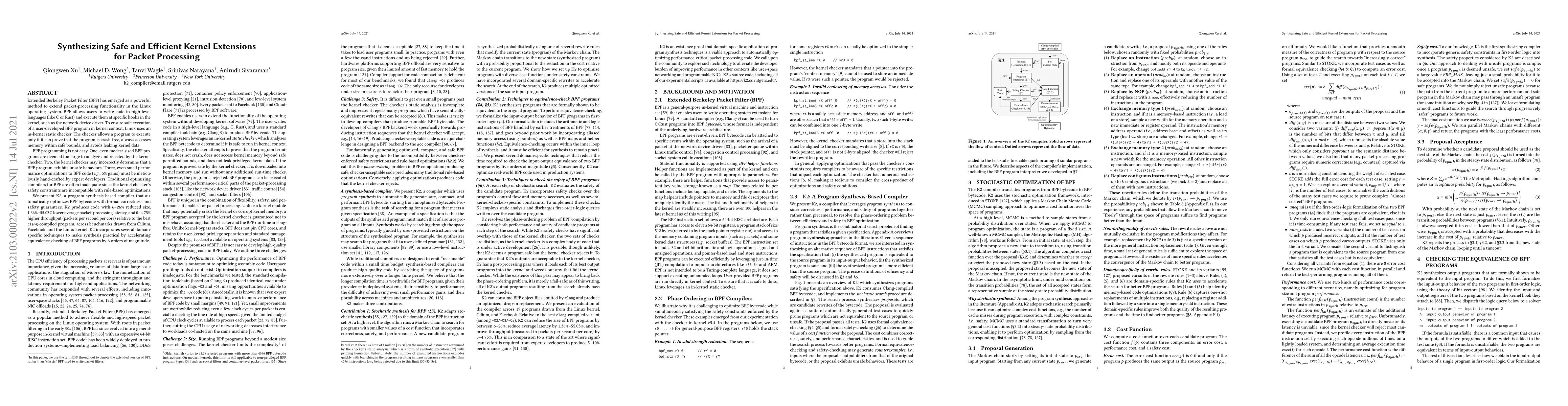 This paper introduces K2, a program-synthesis-based compiler that optimizes Extended Berkeley Packet Filter (BPF) code for packet processing in Linux. K2 achieves significant reductions in size, latency, and improvements in throughput while maintaining safety guarantees through formal verification.