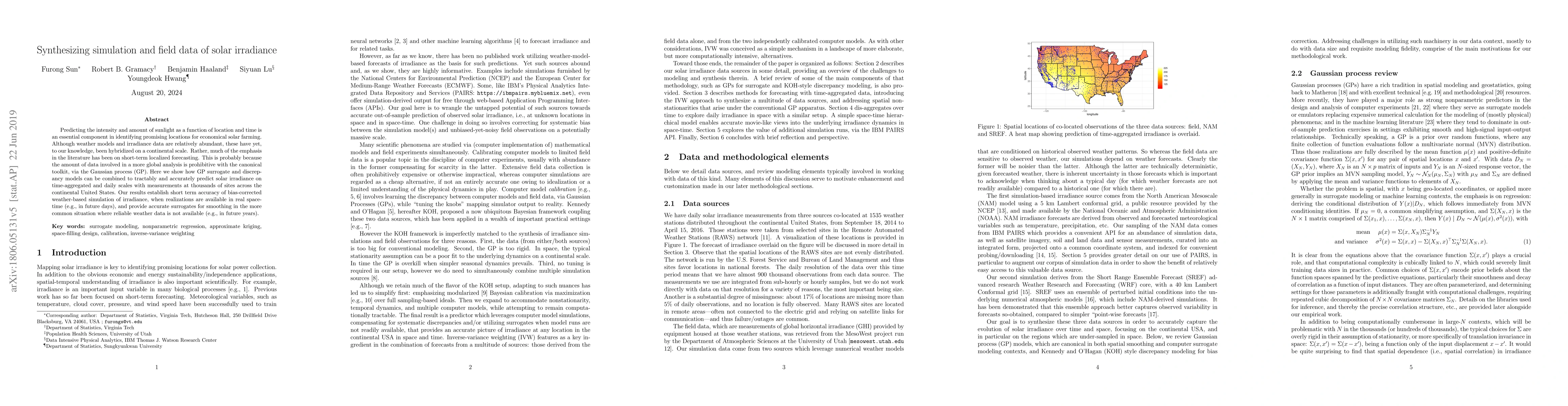 Predicting the intensity and amount of sunlight as a function of location and time is an essential component in identifying promising locations for economical solar farming. Although weather models and irradiance data are relatively abundant, these have yet, to our knowledge, been hybridized on a continental scale. Rather, much of the emphasis in the literature has been on short-term localized forecasting. This is probably because the amount of data involved in a more global analysis is prohibitive with the canonical toolkit, via the Gaussian process (GP). Here we show how GP surrogate and discrepancy models can be combined to tractably and accurately predict solar irradiance on time-aggregated and daily scales with measurements at thousands of sites across the continental United States. Our results establish short term accuracy of bias-corrected weather-based simulation of irradiance, when realizations are available in real space-time (e.g., in future days), and provide accurate surrogates for smoothing in the more common situation where reliable weather data is not available (e.g., in future years).