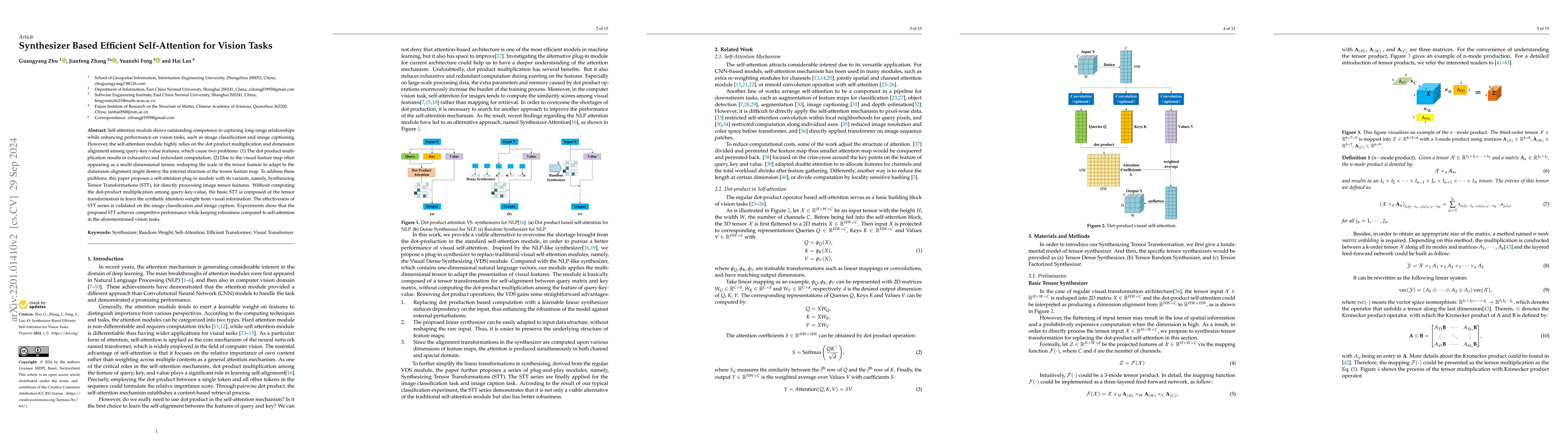Self-attention shows outstanding competence in capturing long-range relationships while enhancing performance on vision tasks, such as image classification and image captioning. However, the self-attention module highly relies on the dot product multiplication and dimension alignment among query-key-value features, which cause two problems: (1) The dot product multiplication results in exhaustive and redundant computation. (2) Due to the visual feature map often appearing as a multi-dimensional tensor, reshaping the scale of the tensor feature to adapt to the dimension alignment might destroy the internal structure of the tensor feature map. To address these problems, this paper proposes a self-attention plug-in module with its variants, namely, Synthesizing Tensor Transformations (STT), for directly processing image tensor features. Without computing the dot-product multiplication among query-key-value, the basic STT is composed of the tensor transformation to learn the synthetic attention weight from visual information. The effectiveness of STT series is validated on the image classification and image caption. Experiments show that the proposed STT achieves competitive performance while keeping robustness compared to self-attention based above vision tasks.