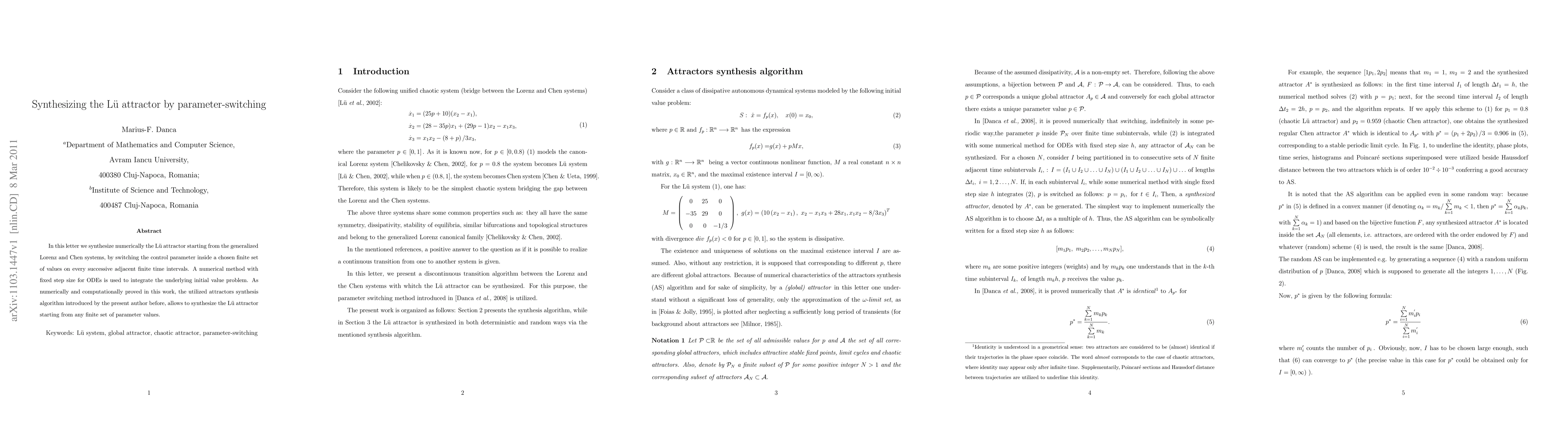 Researchers synthesized the Lülu attractor by switching control parameters in a generalized Lorenz and Chen system, using a numerical method to integrate the underlying initial value problem. The study confirms that the attractor can be generated starting from any finite set of parameter values.