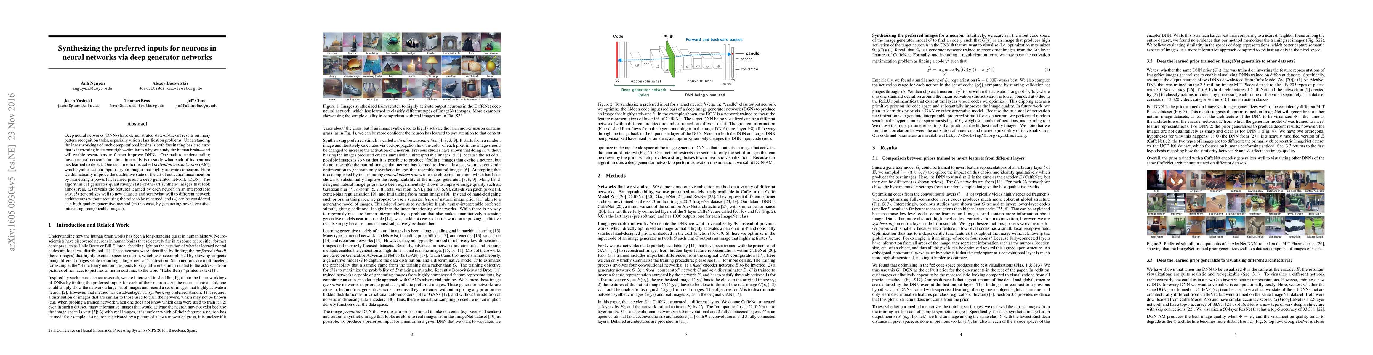 Deep neural networks (DNNs) have demonstrated state-of-the-art results on many pattern recognition tasks, especially vision classification problems. Understanding the inner workings of such computational brains is both fascinating basic science that is interesting in its own right - similar to why we study the human brain - and will enable researchers to further improve DNNs. One path to understanding how a neural network functions internally is to study what each of its neurons has learned to detect. One such method is called activation maximization (AM), which synthesizes an input (e.g. an image) that highly activates a neuron. Here we dramatically improve the qualitative state of the art of activation maximization by harnessing a powerful, learned prior: a deep generator network (DGN). The algorithm (1) generates qualitatively state-of-the-art synthetic images that look almost real, (2) reveals the features learned by each neuron in an interpretable way, (3) generalizes well to new datasets and somewhat well to different network architectures without requiring the prior to be relearned, and (4) can be considered as a high-quality generative method (in this case, by generating novel, creative, interesting, recognizable images).