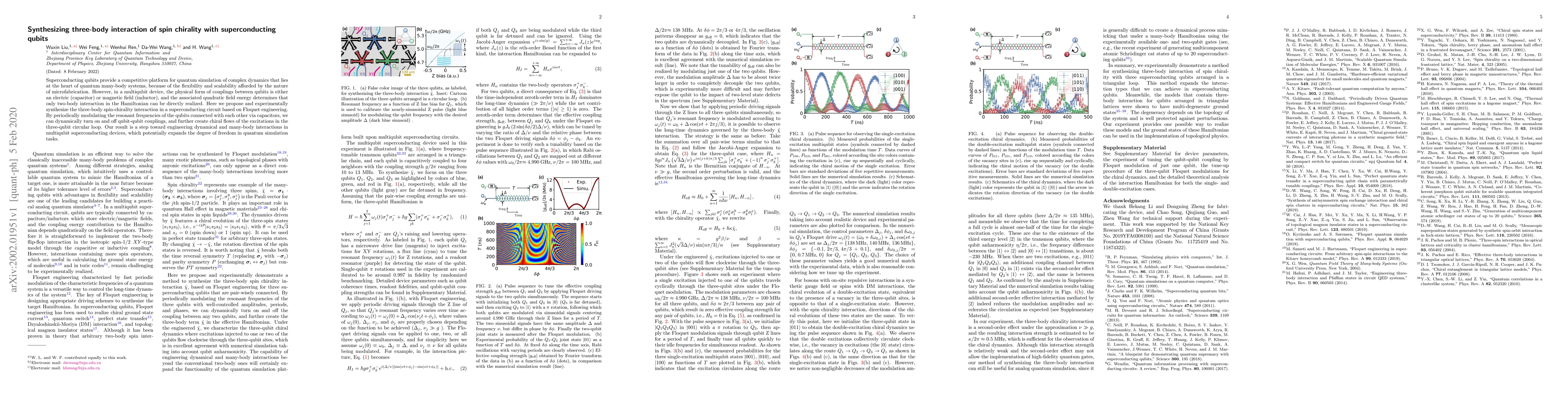 This paper proposes and experimentally demonstrates a method to synthesize three-body spin-chirality interactions in superconducting qubits using Floquet engineering. By modulating qubit resonant frequencies dynamically, the authors achieve chiral flows of excitations in a three-qubit loop, paving the way for more complex quantum simulations in multiqubit systems.