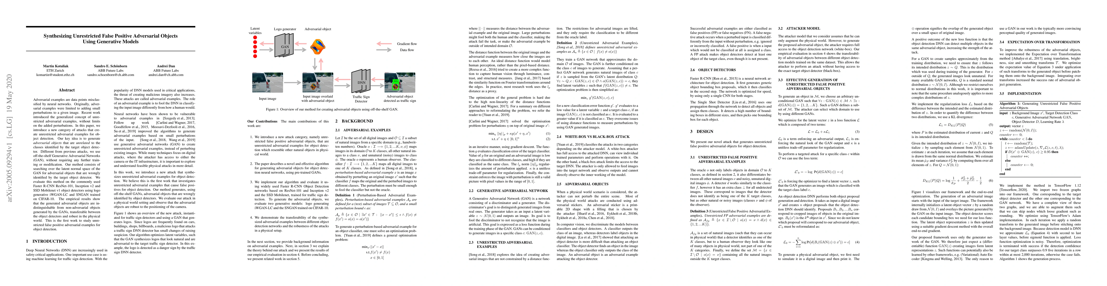 This paper introduces a novel method for generating unrestricted adversarial objects for object detection that are unrelated to the detector's classes, using off-the-shelf Generative Adversarial Networks (GANs). The method is shown to be transferable across different detectors and robust in real-world scenarios.