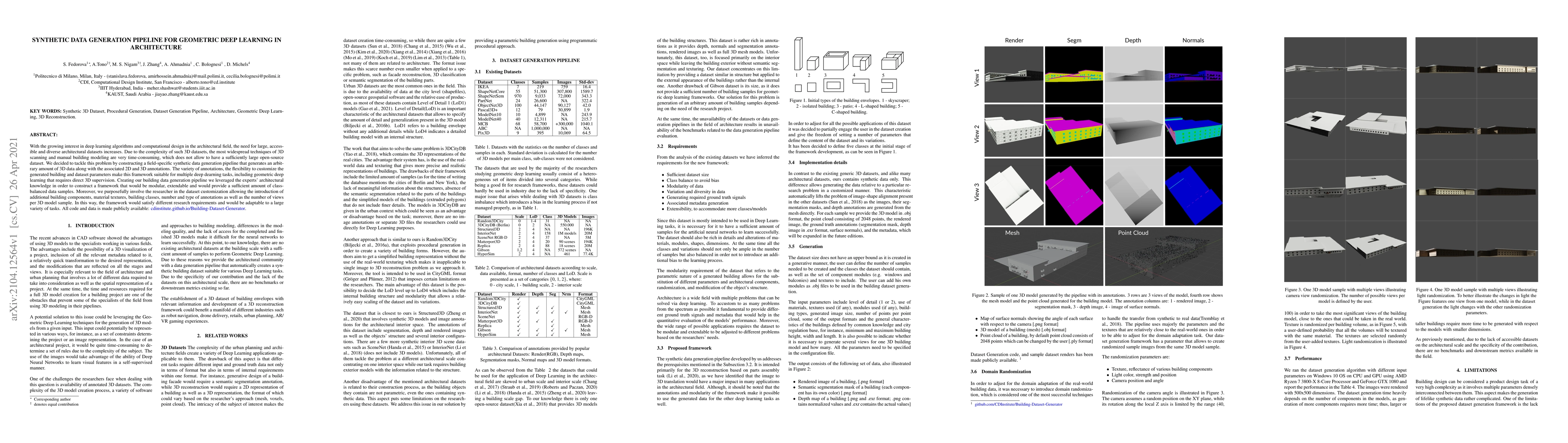 This paper presents a synthetic data generation pipeline for creating large, diverse 3D datasets with associated 2D and 3D annotations for geometric deep learning in architecture. The framework is modular, extendable, and allows researchers to customize various parameters to meet specific research needs.
