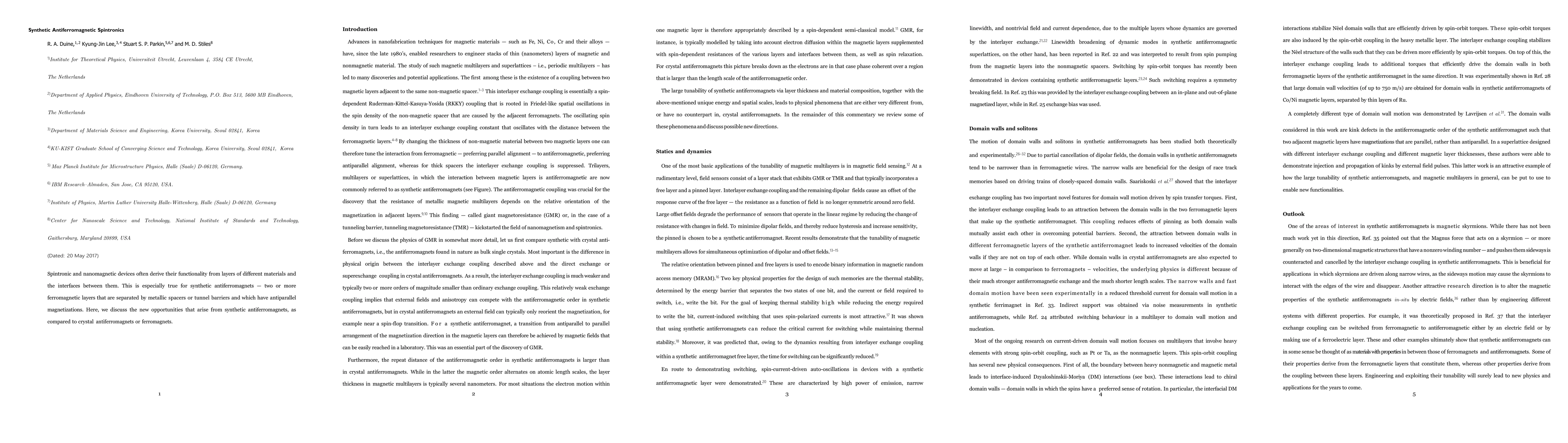 This review discusses synthetic antiferromagnets, composed of ferromagnetic layers with antiparallel magnetizations separated by spacers, offering new opportunities in spintronics compared to crystal antiferromagnets or ferromagnets.