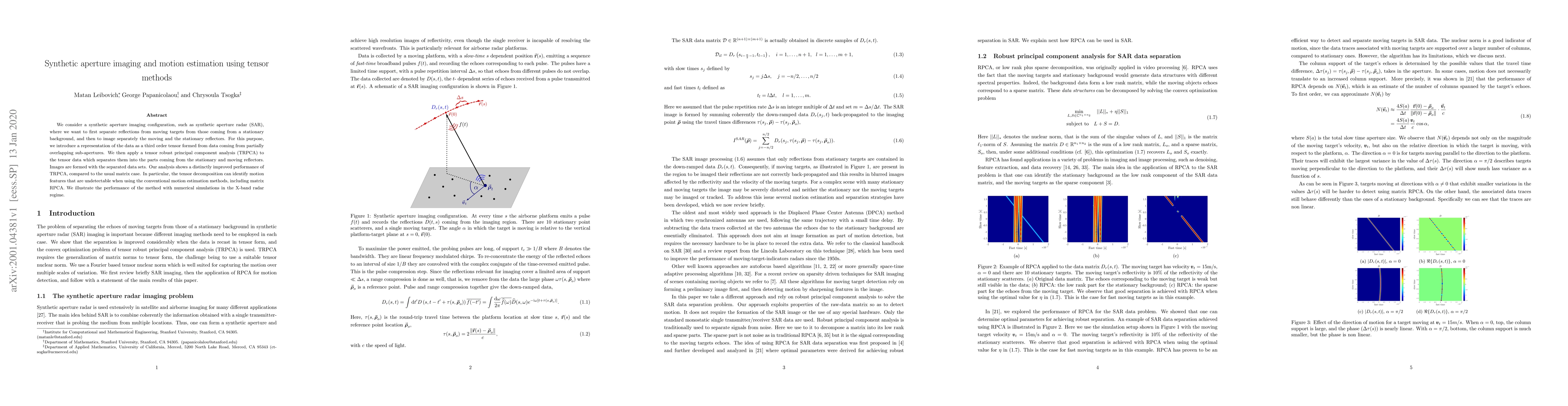 We consider a synthetic aperture imaging configuration, such as synthetic aperture radar (SAR), where we want to first separate reflections from moving targets from those coming from a stationary background, and then to image separately the moving and the stationary reflectors. For this purpose, we introduce a representation of the data as a third order tensor formed from data coming from partially overlapping sub-apertures. We then apply a tensor robust principal component analysis (TRPCA) to the tensor data which separates them into the parts coming from the stationary and moving reflectors. Images are formed with the separated data sets. Our analysis shows a distinctly improved performance of TRPCA, compared to the usual matrix case. In particular, the tensor decomposition can identify motion features that are undetectable when using the conventional motion estimation methods, including matrix RPCA. We illustrate the performance of the method with numerical simulations in the X-band radar regime.