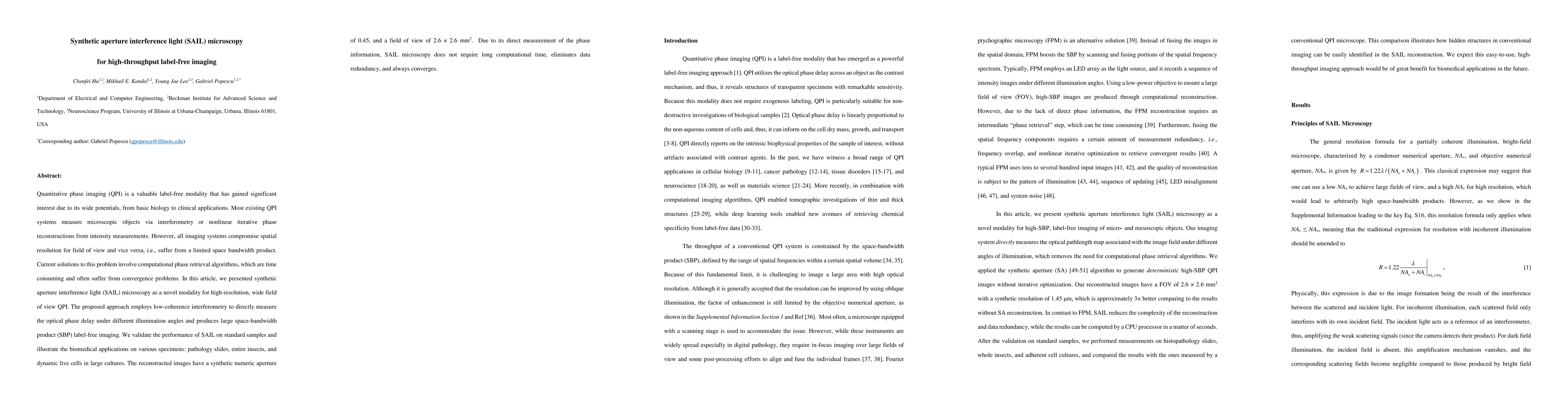 Synthetic aperture interference light (SAIL) microscopy presents a novel high-resolution, wide field of view quantitative phase imaging (QPI) method that leverages low-coherence interferometry for direct phase delay measurement, eliminating the need for time-consuming computational phase retrieval. The approach demonstrates effective biomedical applications on pathology slides, entire insects, and live cell cultures.