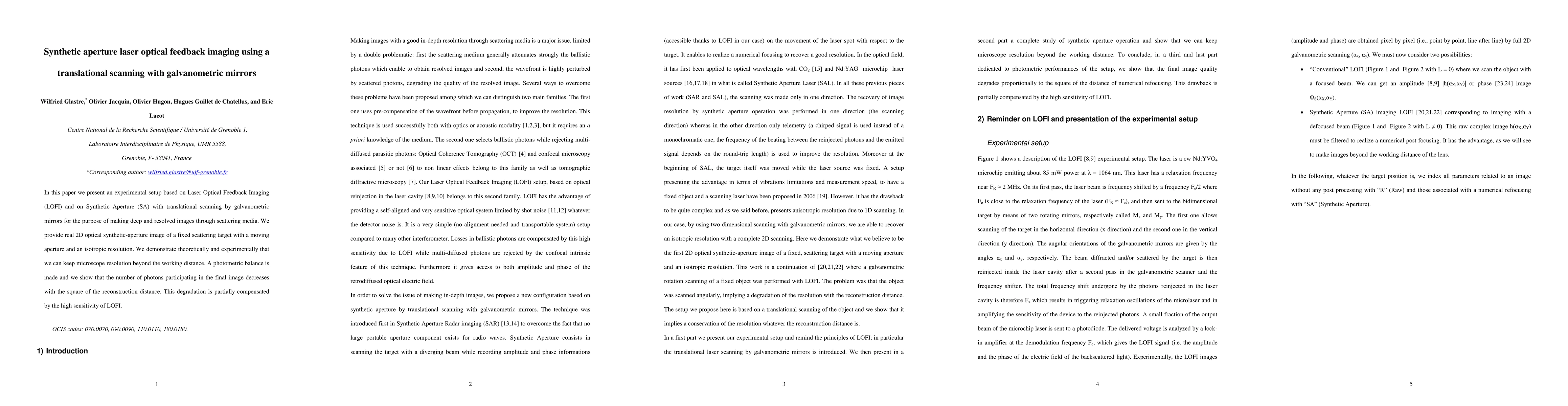 This paper presents an experimental setup using Laser Optical Feedback Imaging (LOFI) and Synthetic Aperture (SA) with galvanometric mirrors for deep, high-resolution imaging through scattering media. The study demonstrates the ability to maintain microscope resolution beyond the working distance, despite a decrease in the number of photons with reconstruction distance, which is partially compensated by LOFI's high sensitivity.