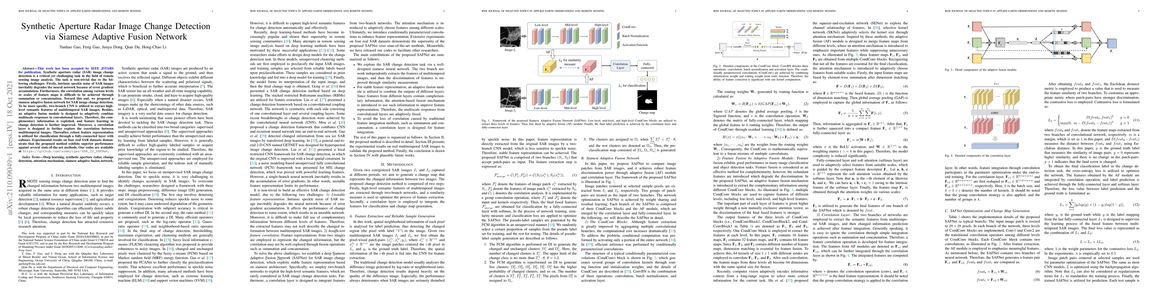 This paper proposes a Siamese Adaptive Fusion Network for Synthetic Aperture Radar (SAR) image change detection, utilizing a two-branch CNN and an adaptive fusion module to extract and combine multiscale features, achieving superior performance over state-of-the-art methods in experiments on four real SAR datasets.