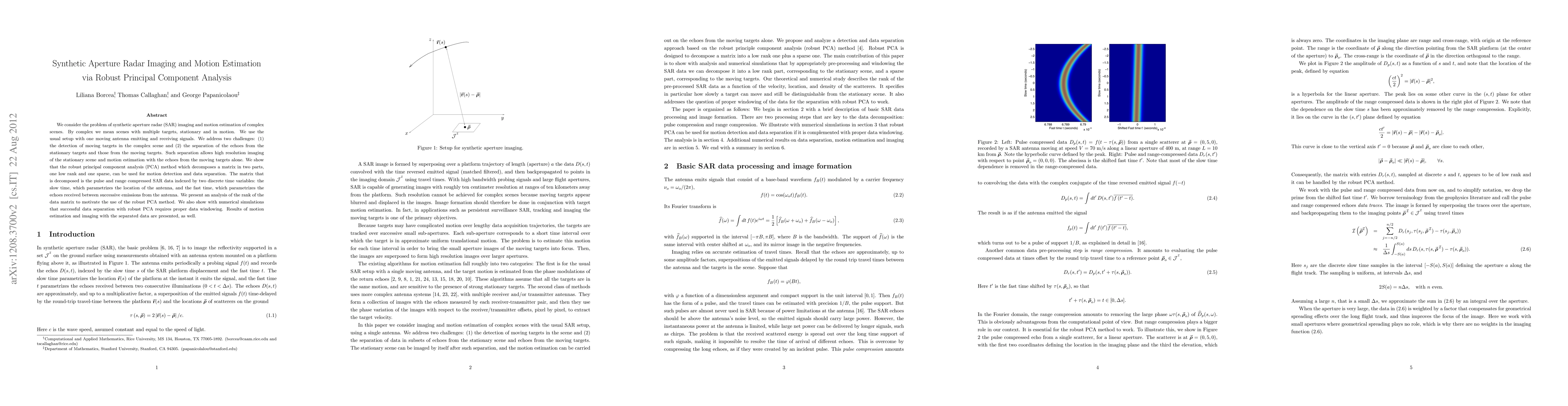 This paper addresses synthetic aperture radar (SAR) imaging and motion estimation in complex scenes with multiple stationary and moving targets using robust principal component analysis (PCA). The method separates echoes from stationary and moving targets, enabling high-resolution imaging and accurate motion estimation.