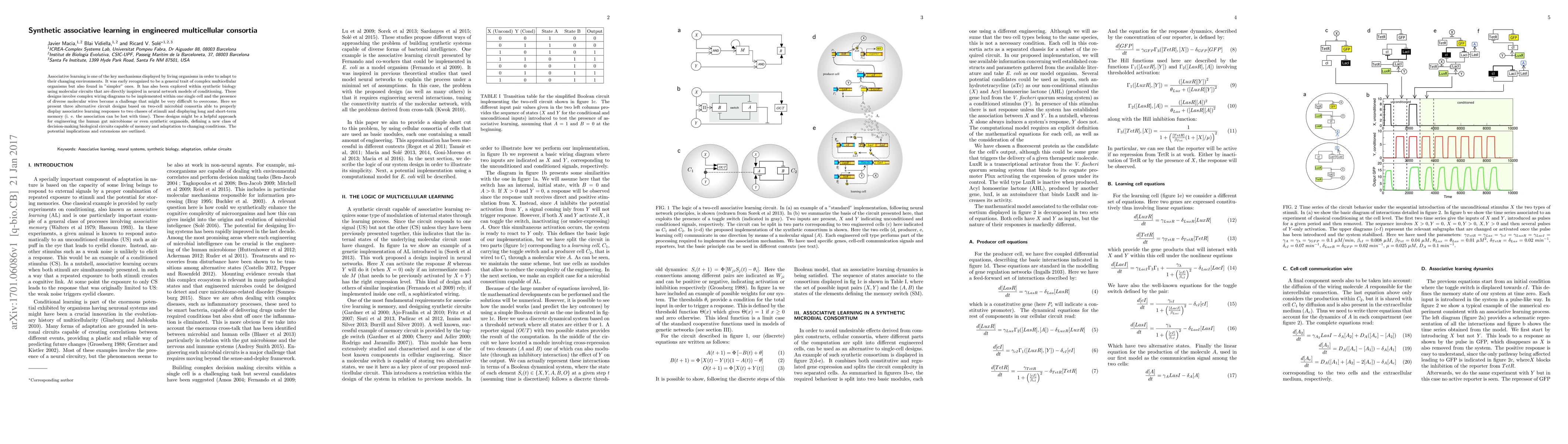 This paper presents three synthetic associative learning designs using two-cell microbial consortia, enabling them to respond to stimuli and exhibit memory. These engineered consortia could advance the engineering of human gut microbiomes and synthetic organoids, offering a new class of adaptive biological circuits.