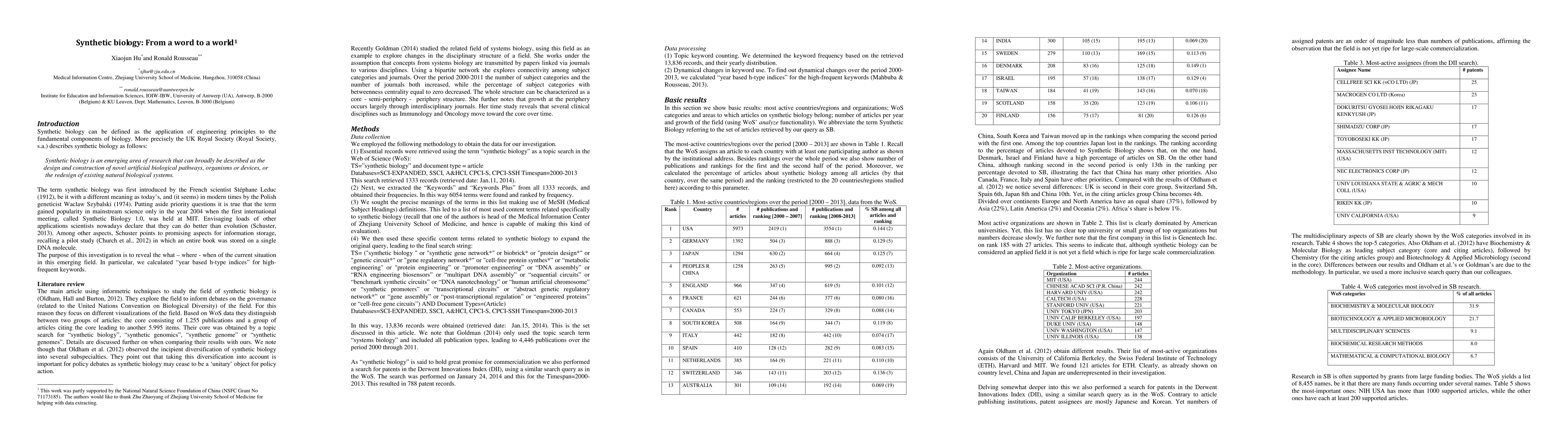 Synthetic biology is one of the battlefields where the main countries fight for the supremacy in science. The word synthetic biology hides a big world, ready to be explored by interdisciplinary research collaborations. The purpose of this investigation is to reveal the what, where, when of the current situation in this emerging field. A keyword search string for the field was constructed and applied in the Web of Science and in the Derwent Innovations Index. In particular, we calculated year based h-type indices for high-frequent keywords.