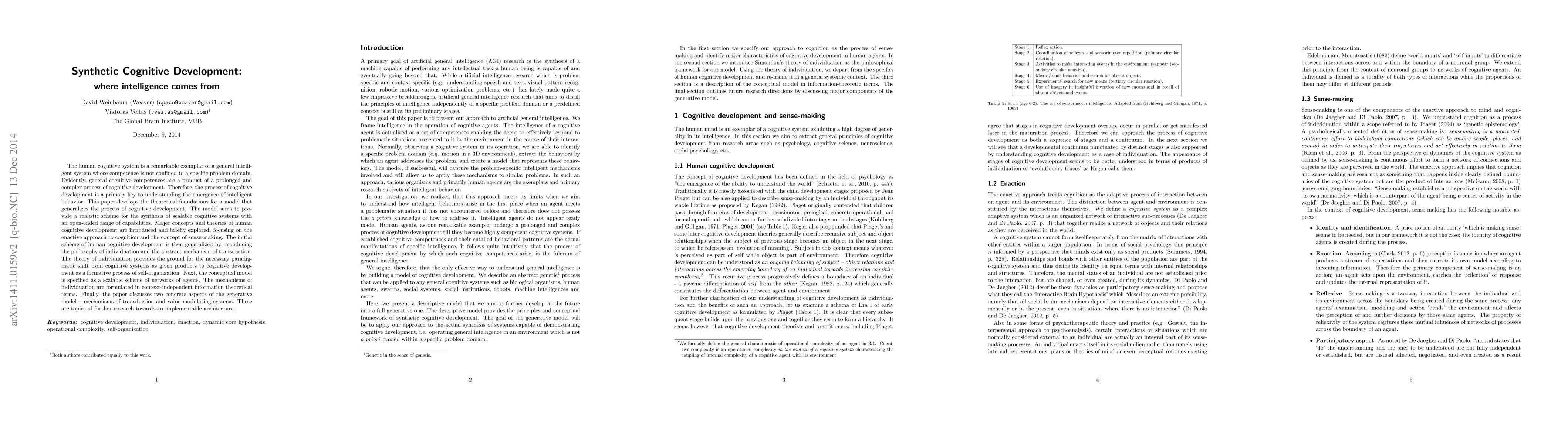 This paper develops a theoretical model for synthetic cognitive development, proposing that intelligence emerges from a complex process of self-organization through the interplay of individuation and transduction mechanisms. The model aims to provide a scalable framework for creating general intelligent systems with open-ended capabilities.