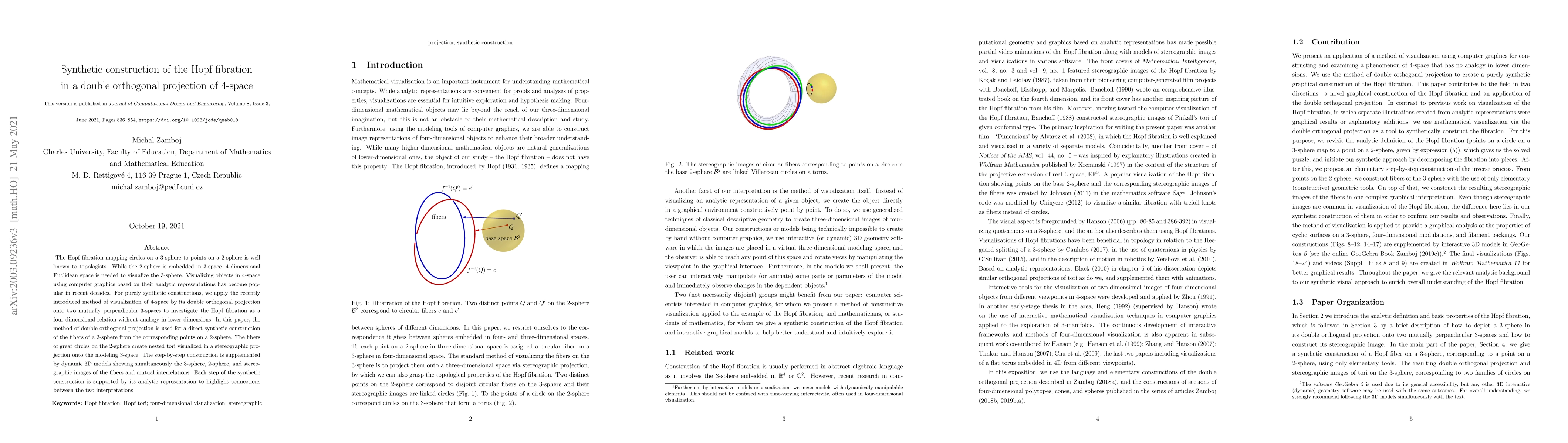 The Hopf fibration mapping circles on a 3-sphere to points on a 2-sphere is well known to topologists. While the 2-sphere is embedded in 3-space, four-dimensional Euclidean space is needed to visualize the 3-sphere. Visualizing objects in 4-space using computer graphics based on their analytical representations has become popular in recent decades. For purely synthetic constructions, we apply the recently introduced method of visualization of 4-space by its double orthogonal projection onto two mutually perpendicular 3-spaces to investigate the Hopf fibration as a four-dimensional relation without analogy in lower dimensions. In this paper, the method of double orthogonal projection is used for a direct synthetic construction of the fibers of a 3-sphere from the corresponding points on a 2-sphere. The fibers of great circles on the 2-sphere create nested tori visualized in a stereographic projection onto the modeling 3-space. The step-by-step construction is supplemented by dynamic three-dimensional models showing simultaneously the 3-sphere, 2-sphere, and stereographic images of the fibers and mutual interrelations. Each step of the synthetic construction is supported by its analytical representation to highlight connections between the two interpretations.