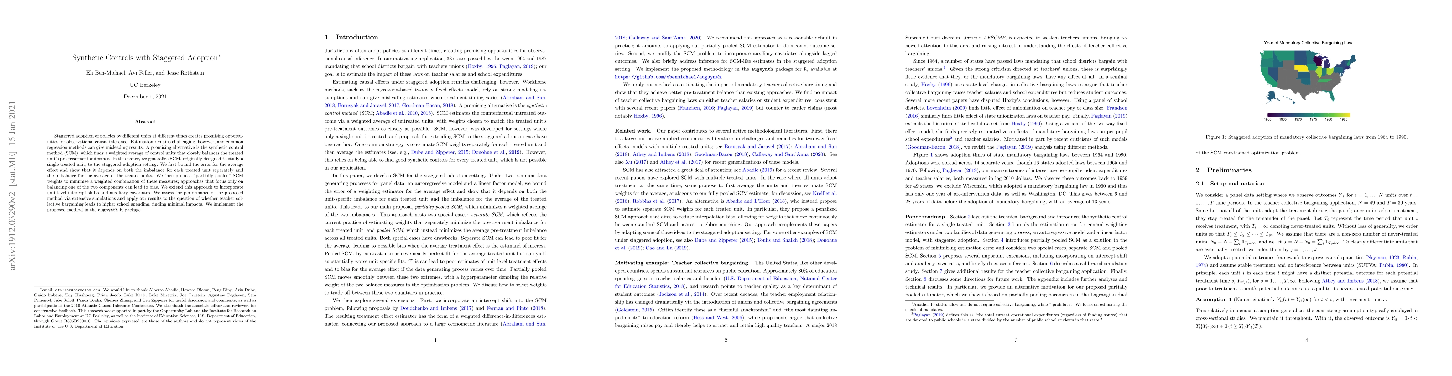 This paper generalizes the synthetic control method (SCM) to handle staggered policy adoption, addressing the challenge of causal inference in such settings. It proposes a "partially pooled" SCM approach that balances both individual and average treated unit imbalances, and evaluates its performance through simulations and an application to teacher collective bargaining's impact on school spending.