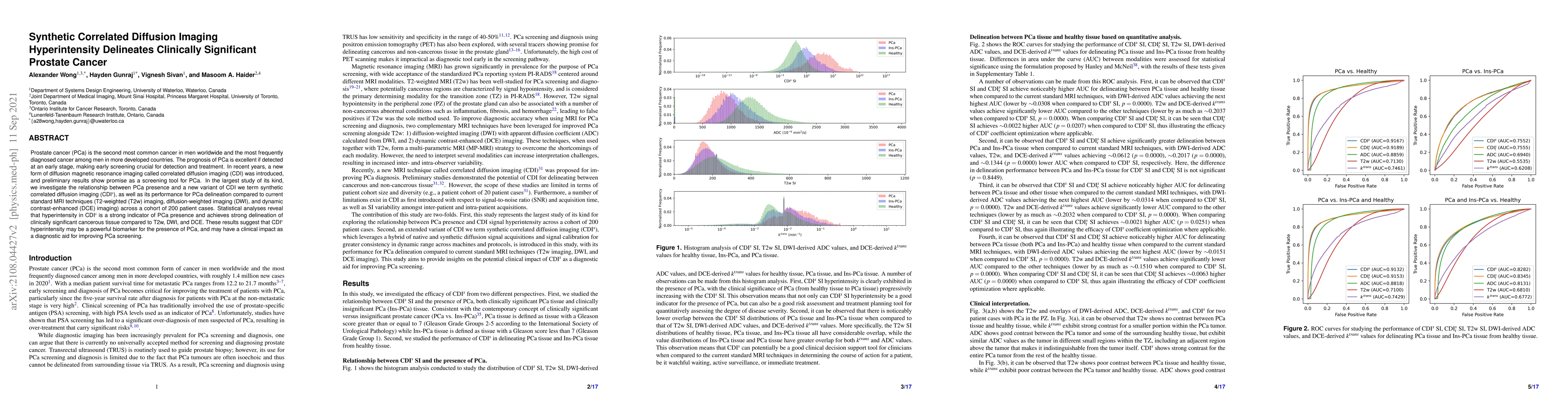 Prostate cancer (PCa) is the second most common cancer in men worldwide and the most frequently diagnosed cancer among men in more developed countries. The prognosis of PCa is excellent if detected at an early stage, making early screening crucial for detection and treatment. In recent years, a new form of diffusion magnetic resonance imaging called correlated diffusion imaging (CDI) was introduced, and preliminary results show promise as a screening tool for PCa. In the largest study of its kind, we investigate the relationship between PCa presence and a new variant of CDI we term synthetic correlated diffusion imaging (CDI$^s$), as well as its performance for PCa delineation compared to current standard MRI techniques (T2-weighted (T2w) imaging, diffusion-weighted imaging (DWI), and dynamic contrast-enhanced (DCE) imaging) across a cohort of 200 patient cases. Statistical analyses reveal that hyperintensity in CDI$^s$ is a strong indicator of PCa presence and achieves strong delineation of clinically significant cancerous tissue compared to T2w, DWI, and DCE. These results suggest that CDI$^s$ hyperintensity may be a powerful biomarker for the presence of PCa, and may have a clinical impact as a diagnostic aid for improving PCa screening.