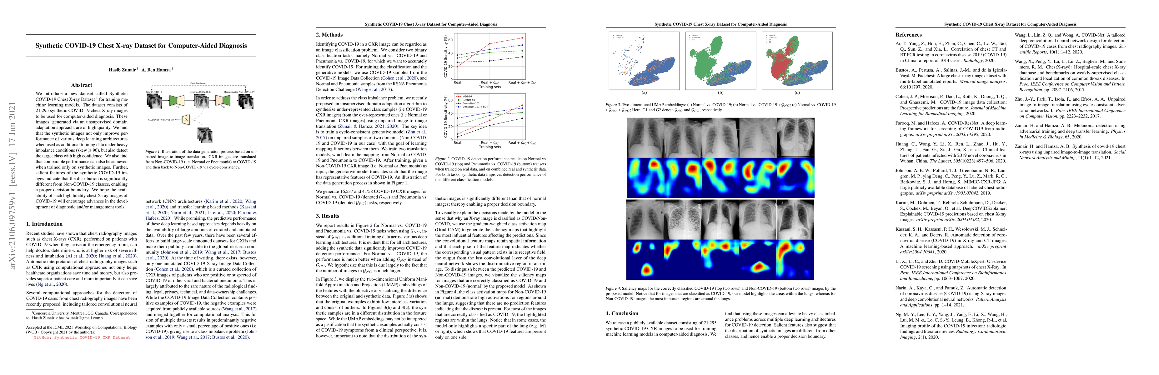 This paper introduces a synthetic COVID-19 chest X-ray dataset comprising 21,295 high-quality images, generated via unsupervised domain adaptation, to aid in computer-aided diagnosis. The synthetic images improve deep learning model performance and can achieve comparable results when trained exclusively, highlighting their utility in addressing data imbalance and enhancing diagnostic tools.