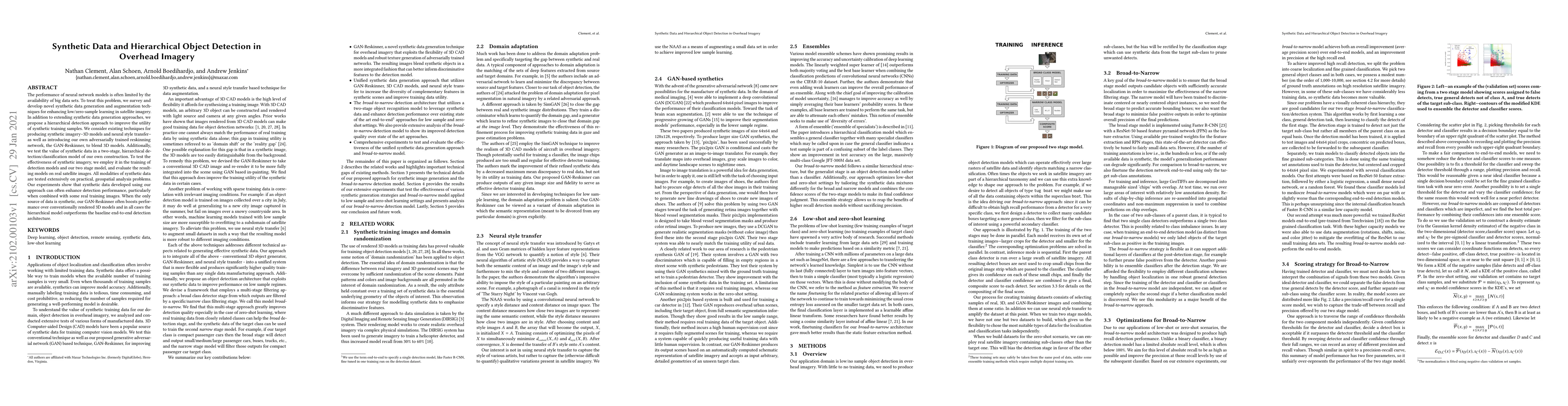 The performance of neural network models is often limited by the availability of big data sets. To treat this problem, we survey and develop novel synthetic data generation and augmentation techniques for enhancing low/zero-sample learning in satellite imagery. In addition to extending synthetic data generation approaches, we propose a hierarchical detection approach to improve the utility of synthetic training samples. We consider existing techniques for producing synthetic imagery--3D models and neural style transfer--as well as introducing our own adversarially trained reskinning network, the GAN-Reskinner, to blend 3D models. Additionally, we test the value of synthetic data in a two-stage, hierarchical detection/classification model of our own construction. To test the effectiveness of synthetic imagery, we employ it in the training of detection models and our two stage model, and evaluate the resulting models on real satellite images. All modalities of synthetic data are tested extensively on practical, geospatial analysis problems. Our experiments show that synthetic data developed using our approach can often enhance detection performance, particularly when combined with some real training images. When the only source of data is synthetic, our GAN-Reskinner often boosts performance over conventionally rendered 3D models and in all cases the hierarchical model outperforms the baseline end-to-end detection architecture.