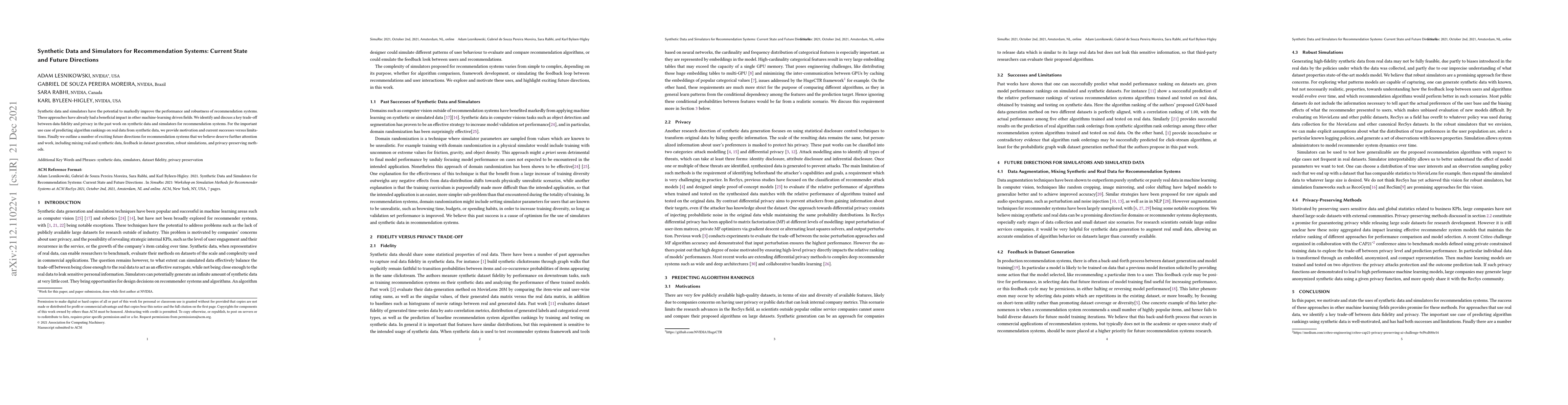 This paper explores the use of synthetic data and simulators to enhance recommendation systems, highlighting their benefits and the trade-off between data fidelity and privacy. It discusses current successes and limitations in predicting algorithm rankings and outlines promising future directions, including integrating real and synthetic data, incorporating feedback in dataset generation, developing robust simulations, and advancing privacy-preserving methods.