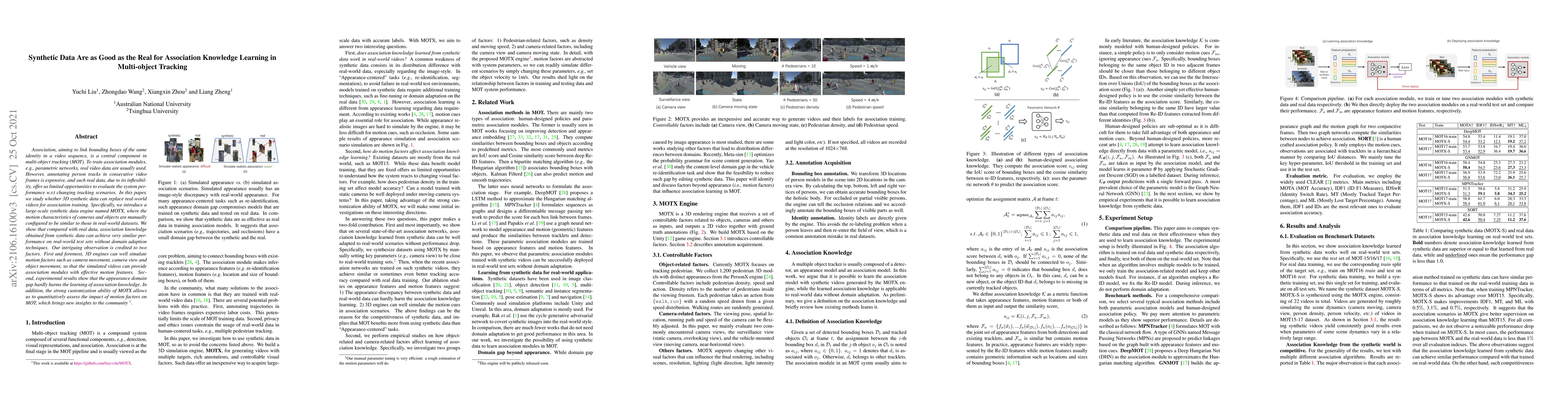Association, aiming to link bounding boxes of the same identity in a video sequence, is a central component in multi-object tracking (MOT). To train association modules, e.g., parametric networks, real video data are usually used. However, annotating person tracks in consecutive video frames is expensive, and such real data, due to its inflexibility, offer us limited opportunities to evaluate the system performance w.r.t changing tracking scenarios. In this paper, we study whether 3D synthetic data can replace real-world videos for association training. Specifically, we introduce a large-scale synthetic data engine named MOTX, where the motion characteristics of cameras and objects are manually configured to be similar to those in real-world datasets. We show that compared with real data, association knowledge obtained from synthetic data can achieve very similar performance on real-world test sets without domain adaption techniques. Our intriguing observation is credited to two factors. First and foremost, 3D engines can well simulate motion factors such as camera movement, camera view and object movement, so that the simulated videos can provide association modules with effective motion features. Second, experimental results show that the appearance domain gap hardly harms the learning of association knowledge. In addition, the strong customization ability of MOTX allows us to quantitatively assess the impact of motion factors on MOT, which brings new insights to the community.