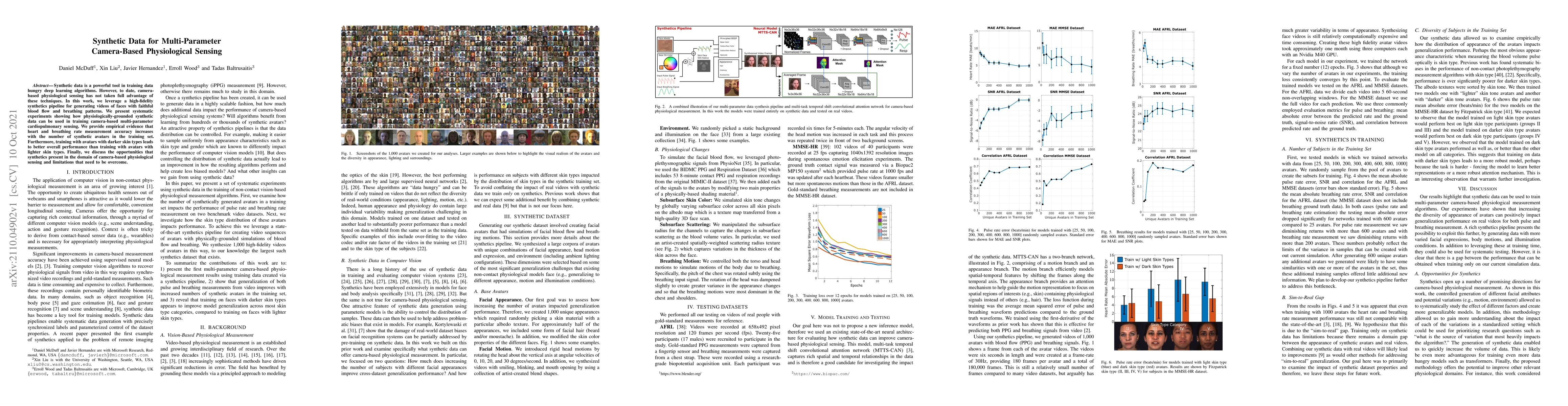 This paper explores the use of synthetic data to enhance training for camera-based multi-parameter physiological sensing, demonstrating improved heart and breathing rate measurement accuracy through the use of synthetic avatars. The study finds that training with avatars featuring darker skin tones yields better overall performance.