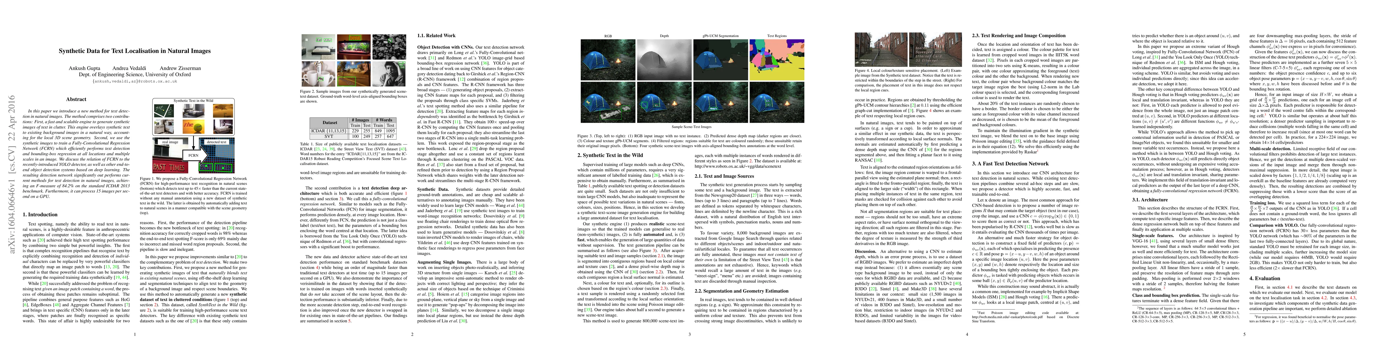 In this paper we introduce a new method for text detection in natural images. The method comprises two contributions: First, a fast and scalable engine to generate synthetic images of text in clutter. This engine overlays synthetic text to existing background images in a natural way, accounting for the local 3D scene geometry. Second, we use the synthetic images to train a Fully-Convolutional Regression Network (FCRN) which efficiently performs text detection and bounding-box regression at all locations and multiple scales in an image. We discuss the relation of FCRN to the recently-introduced YOLO detector, as well as other end-to-end object detection systems based on deep learning. The resulting detection network significantly out performs current methods for text detection in natural images, achieving an F-measure of 84.2% on the standard ICDAR 2013 benchmark. Furthermore, it can process 15 images per second on a GPU.