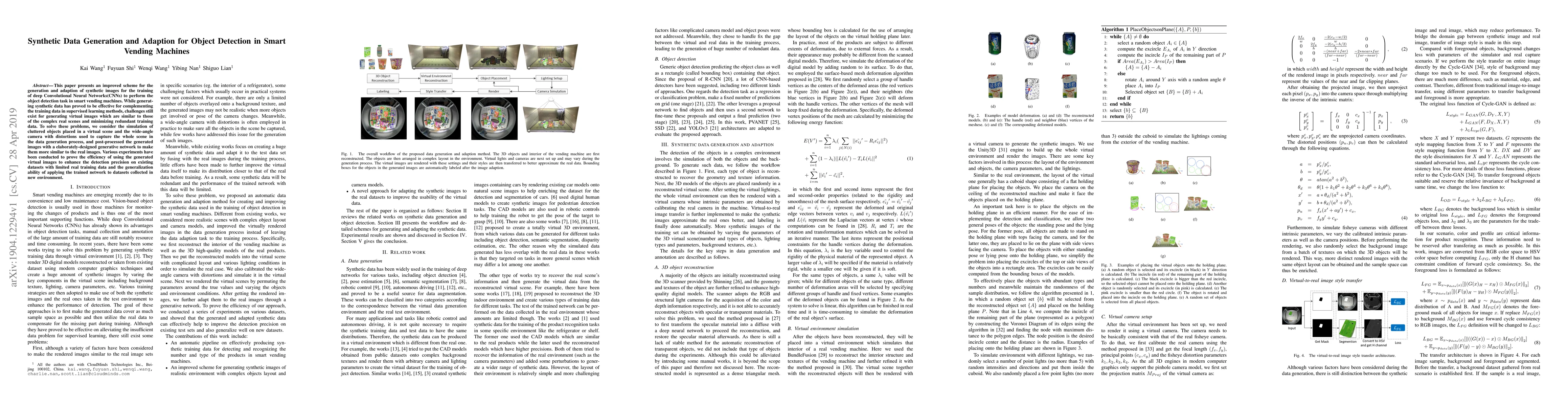This paper presents an improved scheme for the generation and adaption of synthetic images for the training of deep Convolutional Neural Networks(CNNs) to perform the object detection task in smart vending machines. While generating synthetic data has proved to be effective for complementing the training data in supervised learning methods, challenges still exist for generating virtual images which are similar to those of the complex real scenes and minimizing redundant training data. To solve these problems, we consider the simulation of cluttered objects placed in a virtual scene and the wide-angle camera with distortions used to capture the whole scene in the data generation process, and post-processed the generated images with a elaborately-designed generative network to make them more similar to the real images. Various experiments have been conducted to prove the efficiency of using the generated virtual images to enhance the detection precision on existing datasets with limited real training data and the generalization ability of applying the trained network to datasets collected in new environment.
