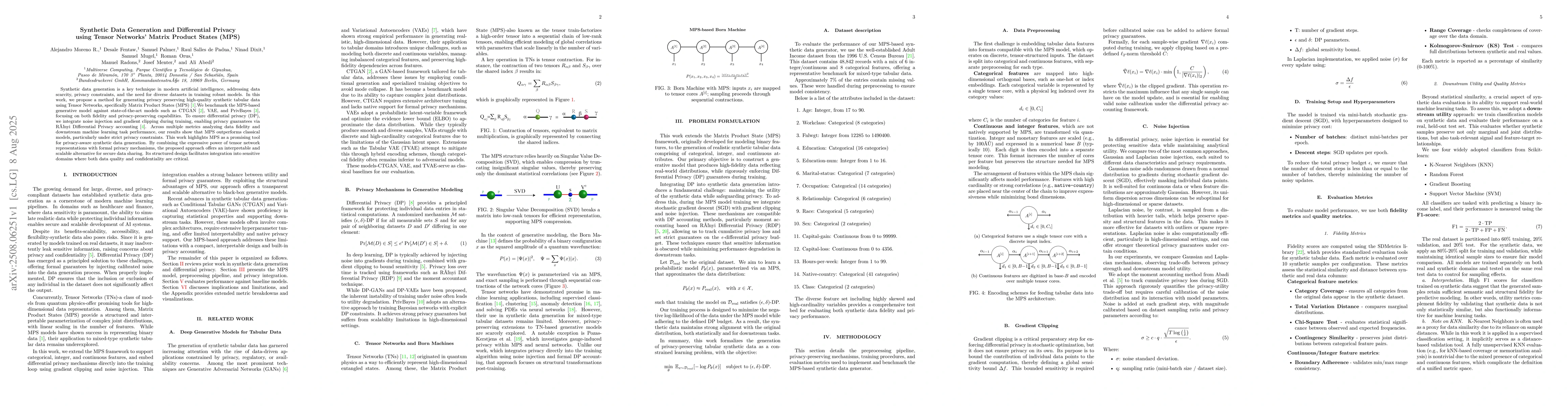 Synthetic data generation is a key technique in modern artificial intelligence, addressing data scarcity, privacy constraints, and the need for diverse datasets in training robust models. In this work, we propose a method for generating privacy-preserving high-quality synthetic tabular data using Tensor Networks, specifically Matrix Product States (MPS). We benchmark the MPS-based generative model against state-of-the-art models such as CTGAN, VAE, and PrivBayes, focusing on both fidelity and privacy-preserving capabilities. To ensure differential privacy (DP), we integrate noise injection and gradient clipping during training, enabling privacy guarantees via R\'enyi Differential Privacy accounting. Across multiple metrics analyzing data fidelity and downstream machine learning task performance, our results show that MPS outperforms classical models, particularly under strict privacy constraints. This work highlights MPS as a promising tool for privacy-aware synthetic data generation. By combining the expressive power of tensor network representations with formal privacy mechanisms, the proposed approach offers an interpretable and scalable alternative for secure data sharing. Its structured design facilitates integration into sensitive domains where both data quality and confidentiality are critical.