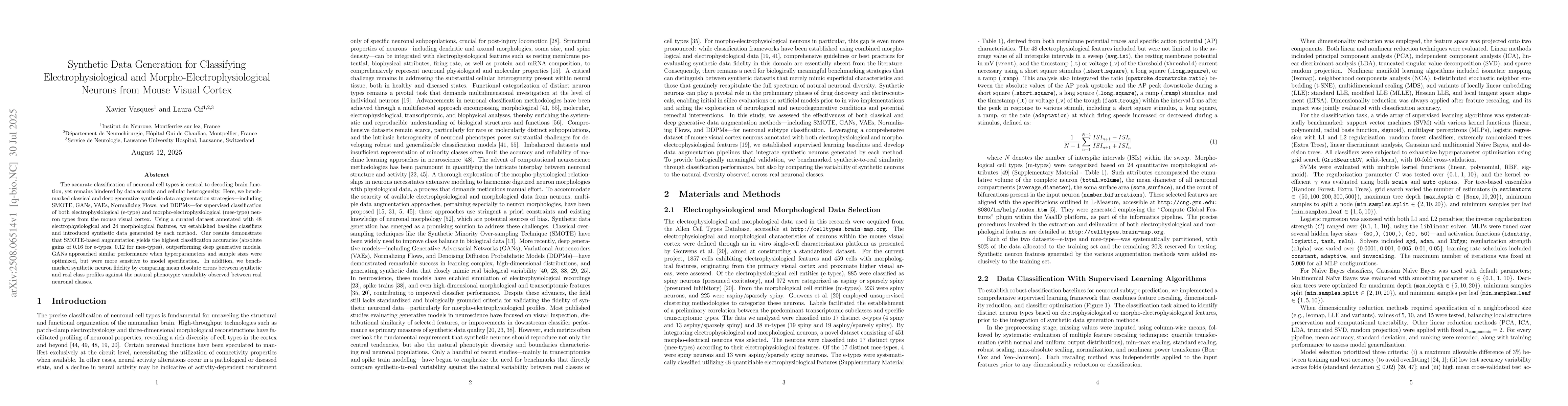 The accurate classification of neuronal cell types is central to decoding brain function, yet remains hindered by data scarcity and cellular heterogeneity. Here, we benchmarked classical and deep generative synthetic data augmentation strategies -- including SMOTE, GANs, VAEs, Normalizing Flows, and DDPMs -- for supervised classification of both electrophysiological (e-type) and morpho-electrophysiological (mee-type) neuron types from the mouse visual cortex. Using a curated dataset annotated with 48 electrophysiological and 24 morphological features, we established baseline classifiers and introduced synthetic data generated by each method. Our results demonstrate that SMOTE-based augmentation yields the highest classification accuracies (absolute gains of 0.16 for e-types, 0.12 for mee-types), outperforming deep generative models. GANs approached similar performance when hyperparameters and sample sizes were optimized, but were more sensitive to model specification. In addition, we benchmarked synthetic neuron fidelity by comparing mean absolute errors between synthetic and real class profiles against the natural phenotypic variability observed between real neuronal classes.