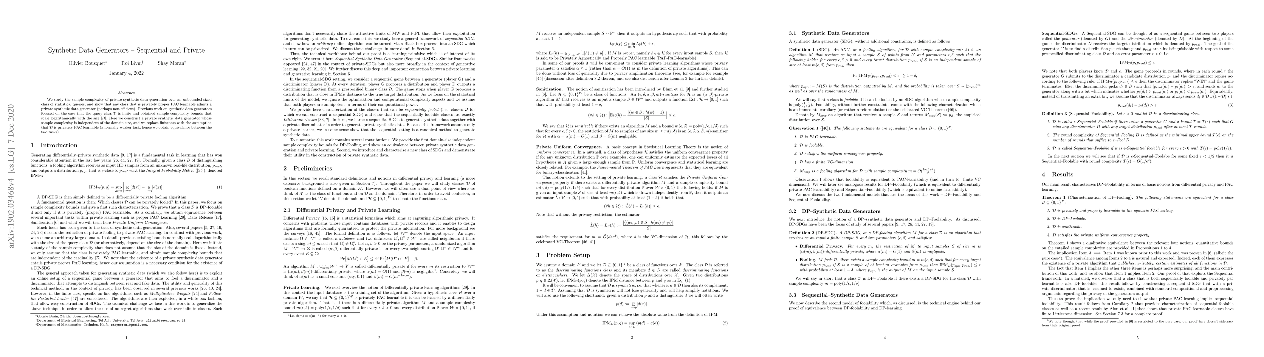 We study the sample complexity of private synthetic data generation over an unbounded sized class of statistical queries, and show that any class that is privately proper PAC learnable admits a private synthetic data generator (perhaps non-efficient). Previous work on synthetic data generators focused on the case that the query class $\mathcal{D}$ is finite and obtained sample complexity bounds that scale logarithmically with the size $|\mathcal{D}|$. Here we construct a private synthetic data generator whose sample complexity is independent of the domain size, and we replace finiteness with the assumption that $\mathcal{D}$ is privately PAC learnable (a formally weaker task, hence we obtain equivalence between the two tasks).