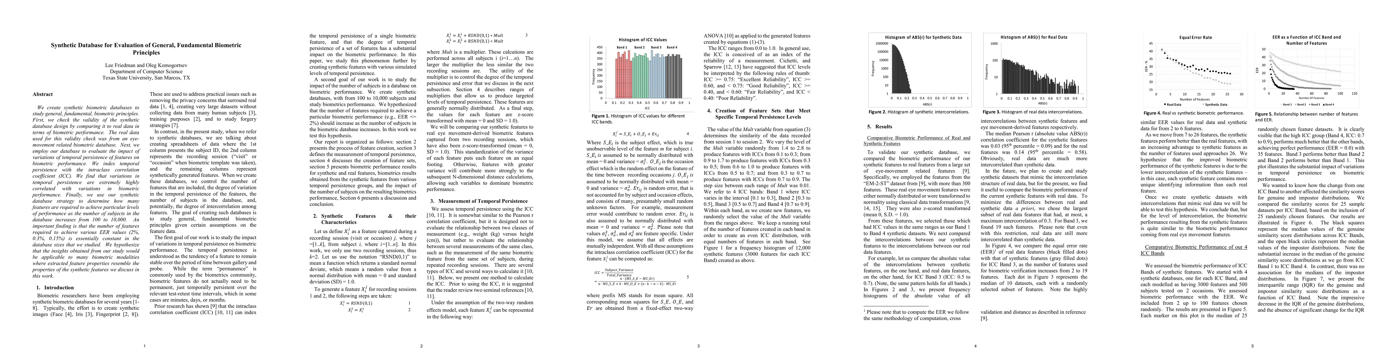 We create synthetic biometric databases to study general, fundamental, biometric principles. First, we check the validity of the synthetic database design by comparing it to real data in terms of biometric performance. The real data used for this validity check was from an eye-movement related biometric database. Next, we employ our database to evaluate the impact of variations of temporal persistence of features on biometric performance. We index temporal persistence with the intraclass correlation coefficient (ICC). We find that variations in temporal persistence are extremely highly correlated with variations in biometric performance. Finally, we use our synthetic database strategy to determine how many features are required to achieve particular levels of performance as the number of subjects in the database increases from 100 to 10,000. An important finding is that the number of features required to achieve various EER values (2%, 0.3%, 0.15%) is essentially constant in the database sizes that we studied. We hypothesize that the insights obtained from our study would be applicable to many biometric modalities where extracted feature properties resemble the properties of the synthetic features we discuss in this work.