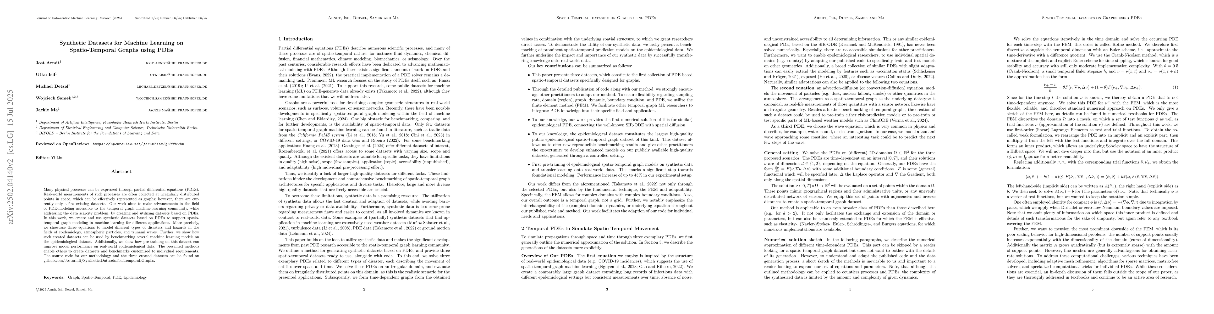 Many physical processes can be expressed through partial differential equations (PDEs). Real-world measurements of such processes are often collected at irregularly distributed points in space, which can be effectively represented as graphs; however, there are currently only a few existing datasets. Our work aims to make advancements in the field of PDE-modeling accessible to the temporal graph machine learning community, while addressing the data scarcity problem, by creating and utilizing datasets based on PDEs. In this work, we create and use synthetic datasets based on PDEs to support spatio-temporal graph modeling in machine learning for different applications. More precisely, we showcase three equations to model different types of disasters and hazards in the fields of epidemiology, atmospheric particles, and tsunami waves. Further, we show how such created datasets can be used by benchmarking several machine learning models on the epidemiological dataset. Additionally, we show how pre-training on this dataset can improve model performance on real-world epidemiological data. The presented methods enable others to create datasets and benchmarks customized to individual requirements. The source code for our methodology and the three created datasets can be found on https://github.com/github-usr-ano/Temporal_Graph_Data_PDEs.